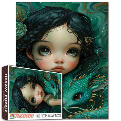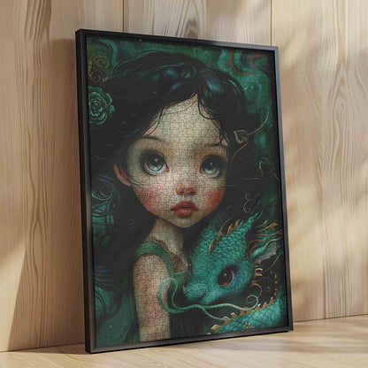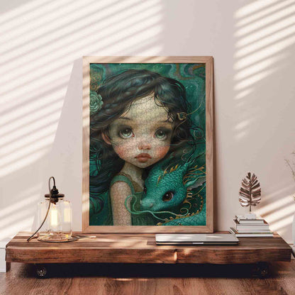 Plongez dans un monde fantastique avec ce puzzle enchanteur mettant en scène une jeune fille et son compagnon dragon mystique. La jeune fille, vêtue d'une robe émeraude fluide, se tient gracieusement aux côtés du dragon, ses cheveux noirs ornés d'une délicate couronne de fleurs. Le dragon, avec ses écailles chatoyantes et ses touches dorées, contraste magnifiquement avec la douceur de la nature. Reconstituez cette scène magique et plongez dans une histoire merveilleuse, où créatures mythiques et atmosphère sereine captivent le cœur et l'imagination.