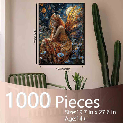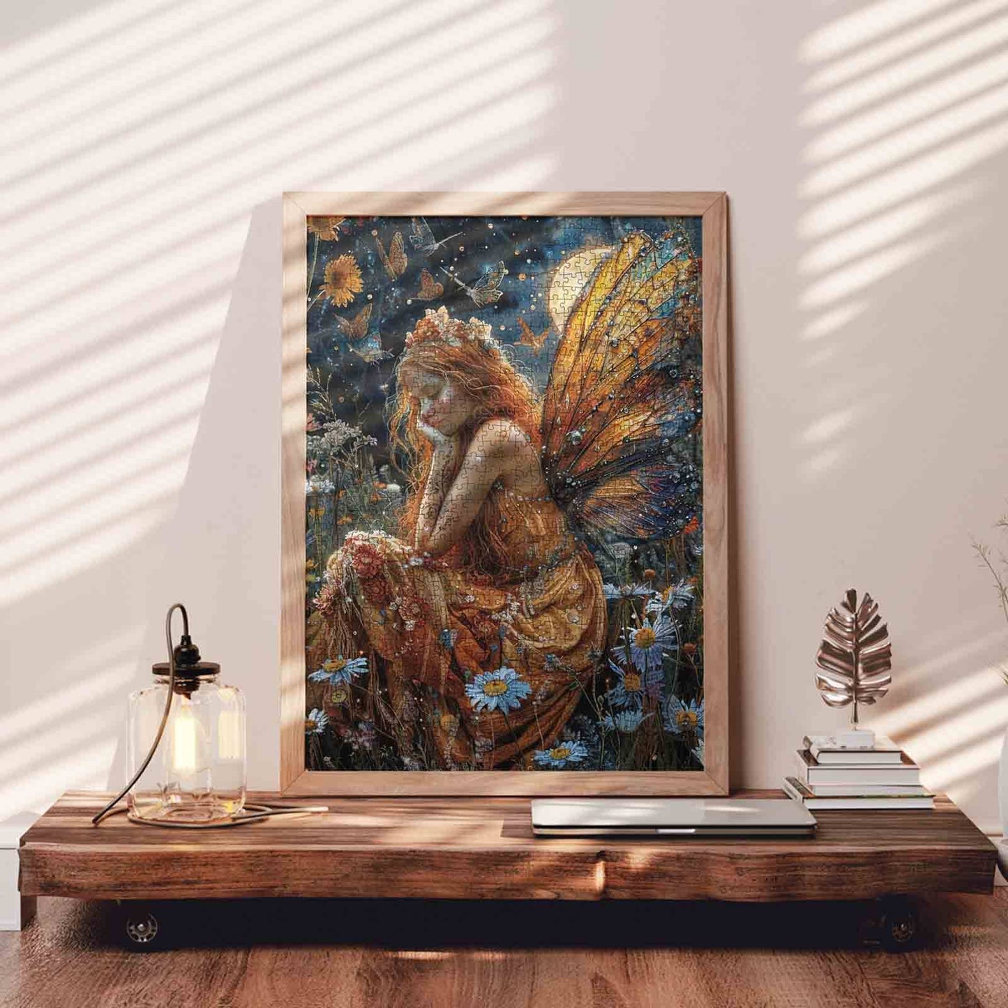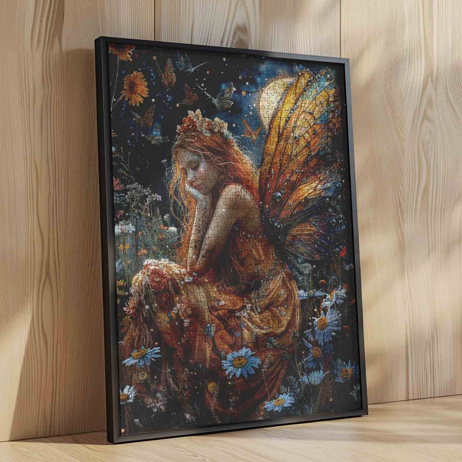 Sous la lueur de la pleine lune, une fée mélancolique est assise parmi les fleurs sauvages, ses ailes scintillant de poussière d'étoiles. Des papillons flottent doucement dans l'air nocturne, l'entourant d'une danse silencieuse et merveilleuse. Avec une couronne de fleurs dans ses cheveux roux et une robe dorée ornée de pétales, elle semble perdue dans un univers onirique entre nuit et magie. Chaque pièce donne vie à la sérénité et à l'imagination de cette scène de jardin crépusculaire.