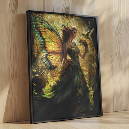 Plongez dans une forêt magique avec ce puzzle captivant. Il met en scène une fée rayonnante dans une robe verte fluide avec des ailes de papillon, entourée d'une scène boisée lumineuse et de détails vibrants. Chaque pièce révèle une histoire d'émerveillement et de beauté, ce qui la rend parfaite pour les amoureux des fées.