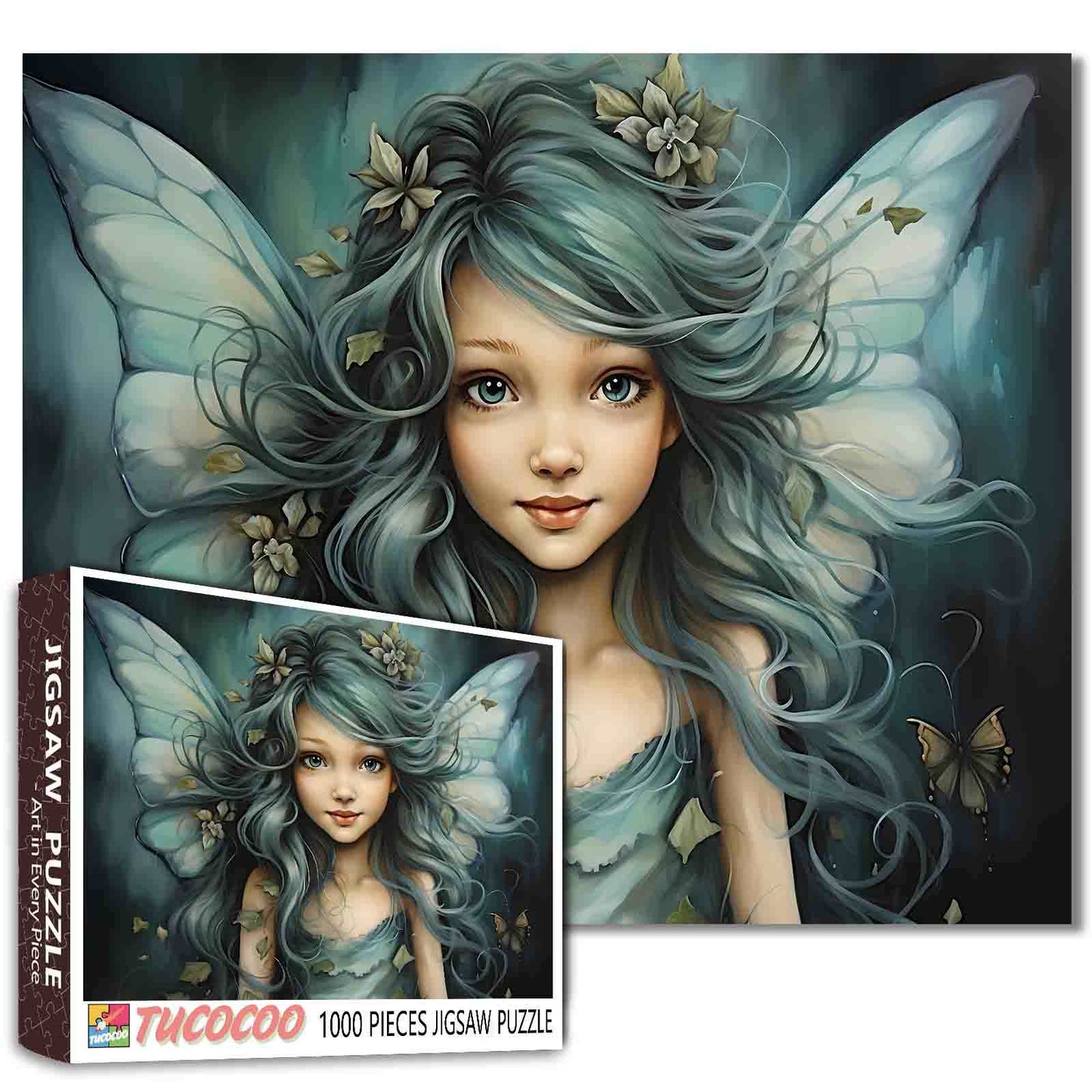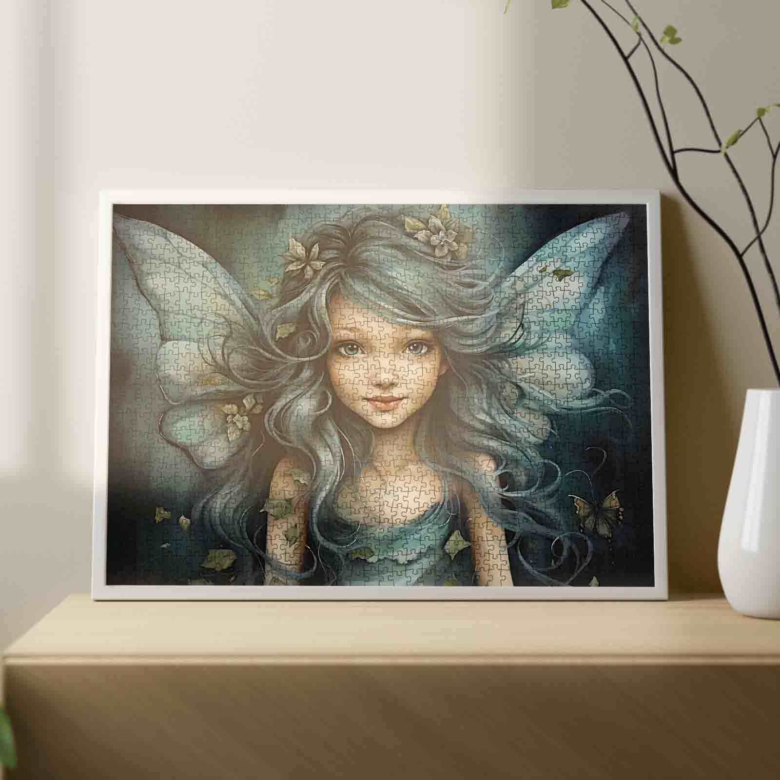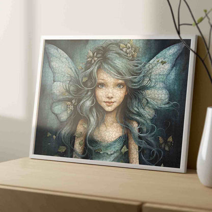 Une douce fée aux doux cheveux bleu sarcelle contemple l'horizon avec un sourire serein, entourée de feuilles délicates et d'ailes lumineuses. Sa présence enchantée emplit l'air frais et bleu de la forêt, des pétales flottant autour d'elle et un petit papillon flottant à proximité. Les lignes fluides de sa coiffure et de sa robe créent un rythme magique, transformant ce puzzle en une expérience paisible et onirique.
