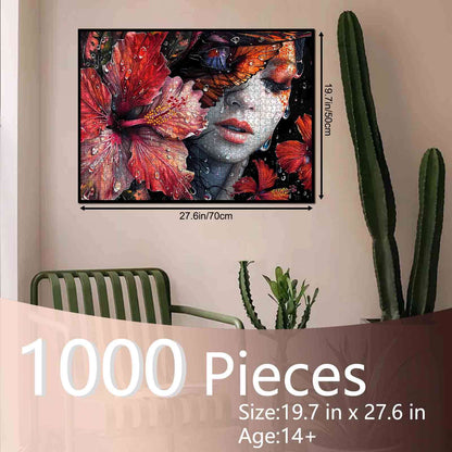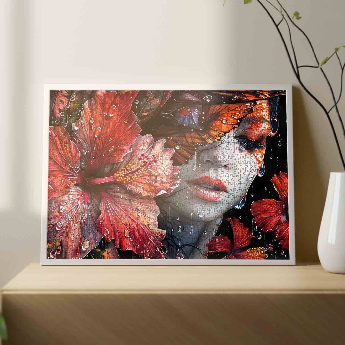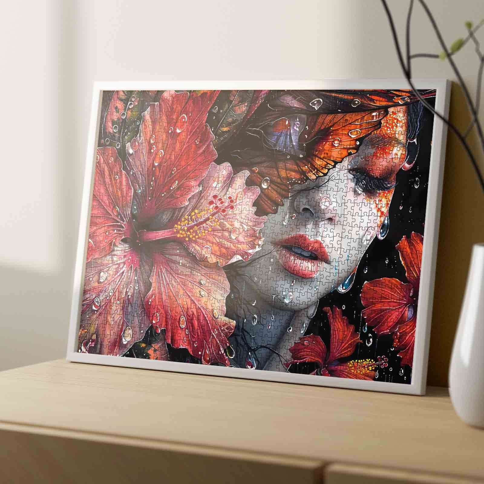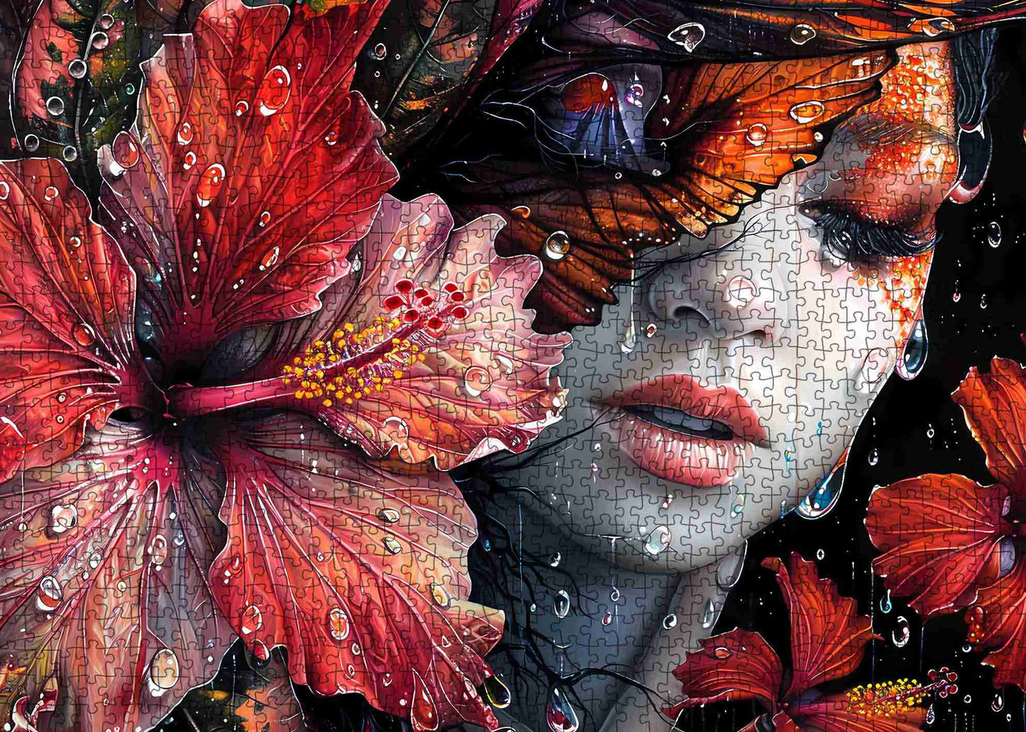 Les gouttes de pluie scintillent sur d'audacieux pétales d'hibiscus tandis que le visage d'une femme mystérieuse émerge de l'ombre, la peau caressée par l'eau qui tombe. Des ailes de papillon drapent ses yeux tel un masque, brouillant la frontière entre l'humain et la nature. Chaque détail – lèvres éclatantes, gouttelettes ornées de joyaux et textures vibrantes – vous plonge dans un jardin surréaliste de couleurs et d'émotions. Un puzzle qui capture la puissance fragile de la beauté en mouvement.