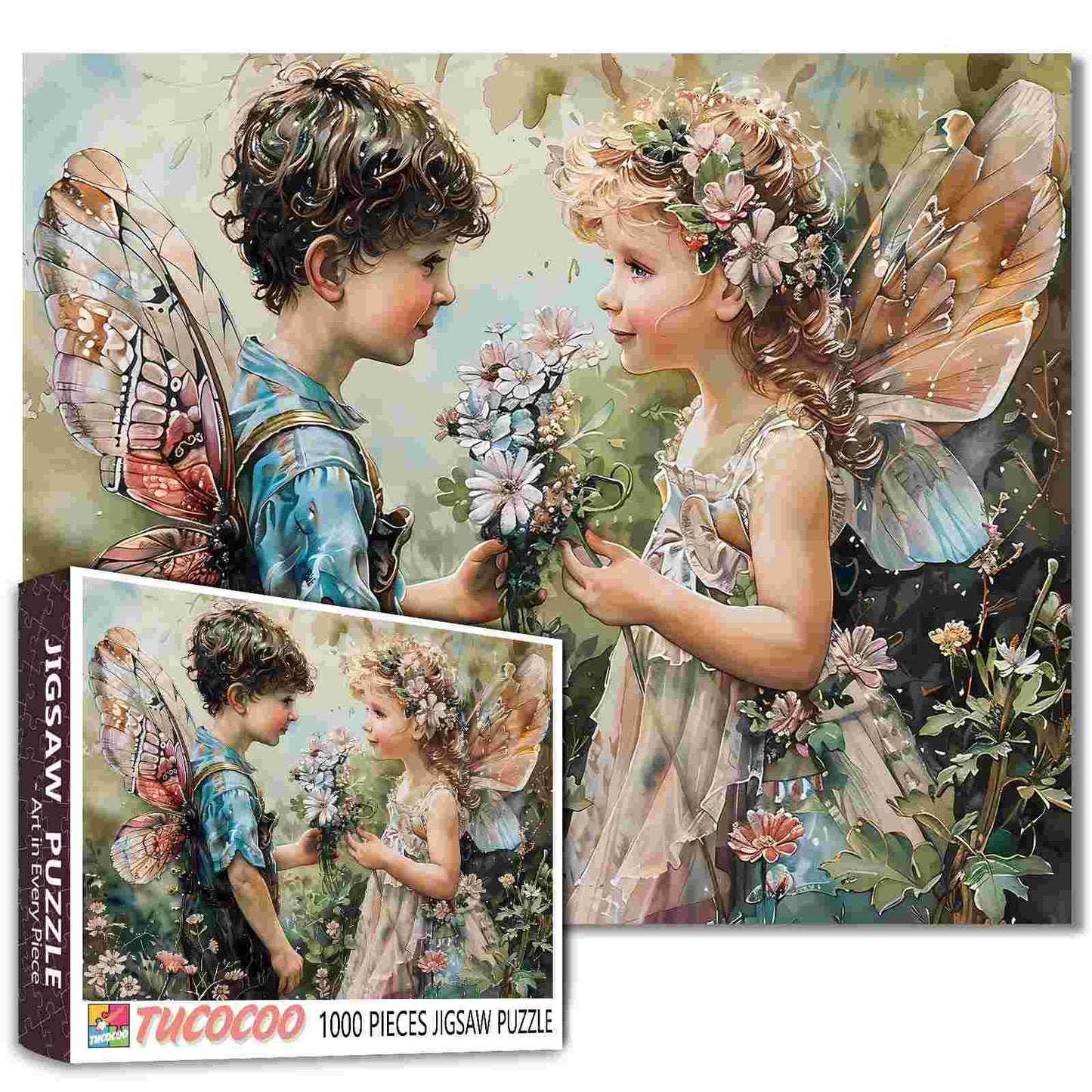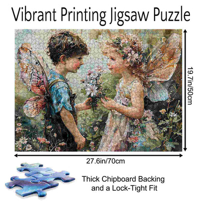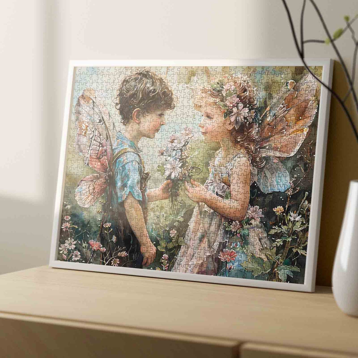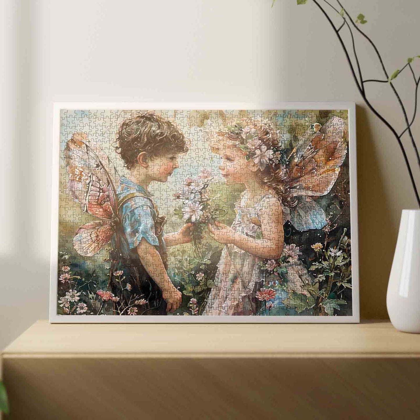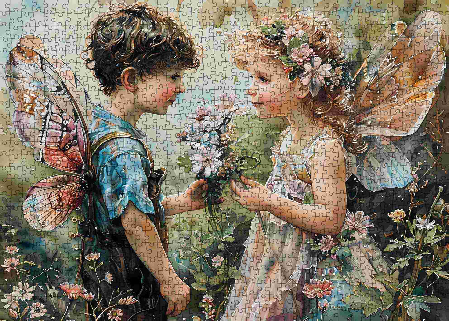 Dans un jardin luxuriant, deux enfants aux délicates ailes de papillon se tiennent face à face, échangeant des fleurs, leur lien rayonnant tel un secret murmuré parmi les fleurs. Les ailes complexes des enfants scintillent au soleil, assorties aux couleurs vibrantes des fleurs qu'ils tiennent. Chaque pétale, chaque feuille de la scène raconte une histoire d'innocence et de beauté. La verdure luxuriante et les douces couleurs pastel créent une atmosphère sereine et enchanteresse, vous invitant dans un monde magique, empreint d'émerveillement et d'amitié. Ce puzzle vous promet une expérience captivante et paisible en reconstituant les moments charmants de ces deux jeunes âmes dans la nature.