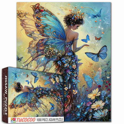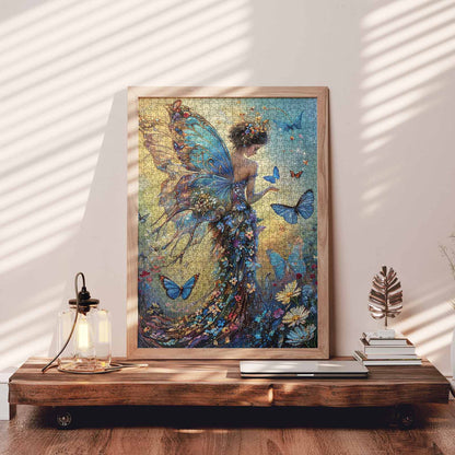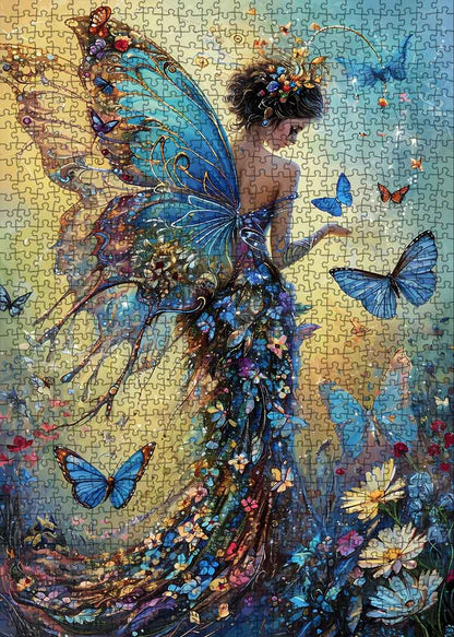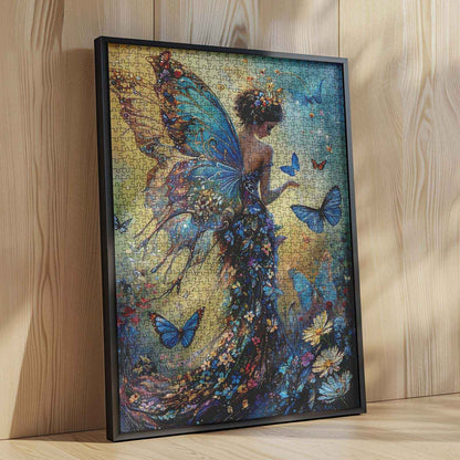 Laissez-vous séduire par le charme envoûtant de notre puzzle de fées. Une fée parée de superbes ailes bleues se tient dans un tourbillon de fleurs et de papillons, sa robe se fondant dans les fleurs qui l'entourent. Chaque détail, de la douce lueur aux motifs complexes, vous invite à assembler une scène débordante d'élégance, de nature et de magie.