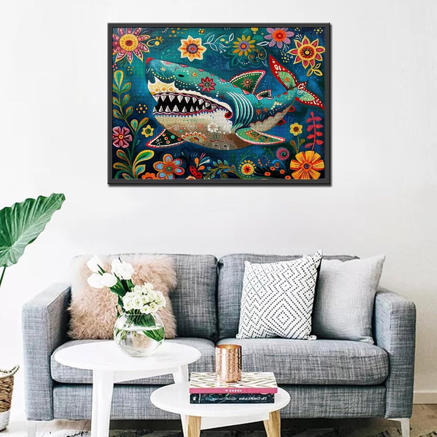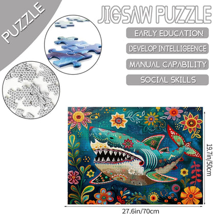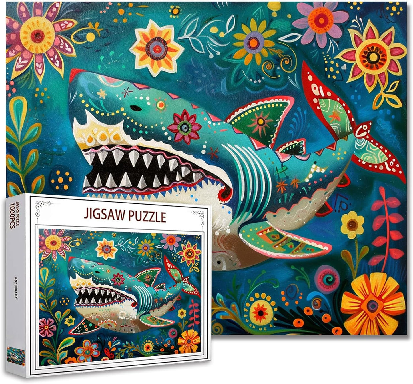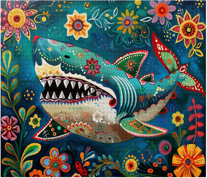 Sous la surface colorée de la mer nage un requin féroce et festif, orné de motifs fantaisistes et entouré d'éclats floraux éclatants. Avec ses dents acérées et son expression audacieuse, cette créature apporte un mélange vibrant de danger et de décoration à votre expérience de puzzle. Des détails ludiques sur ses nageoires, son visage et sa queue invitent à une observation plus attentive, tandis que les plantes tourbillonnantes et les fleurs épanouies ajoutent une touche de gaieté. Plongez dans cet univers océanique insolite où la nature rencontre l'art.