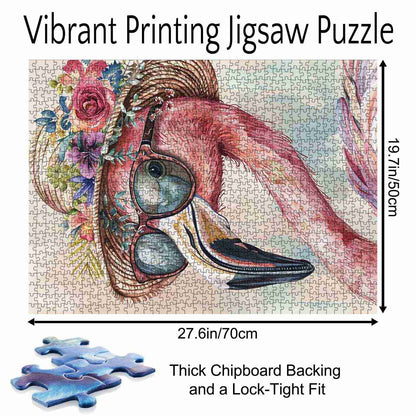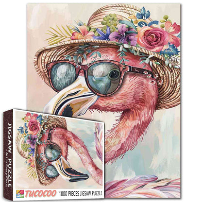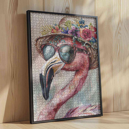 Un flamant chic, affublé de lunettes de soleil élégantes et d'une magnifique couronne de fleurs, respire l'élégance et le charme. Le doux fond pastel met en valeur les traits gracieux du flamant, créant une scène parfaite pour les amateurs de puzzles. Associez couleurs vives et détails complexes pour une expérience relaxante.