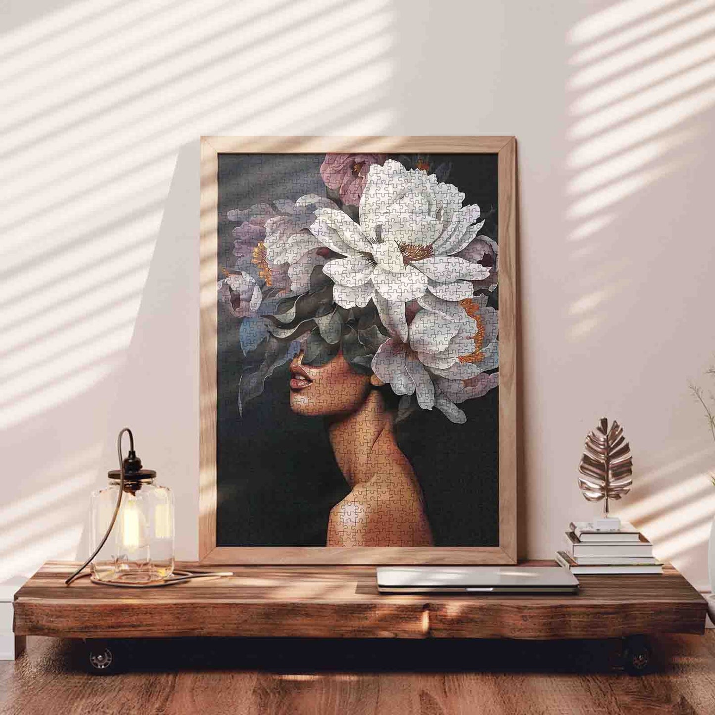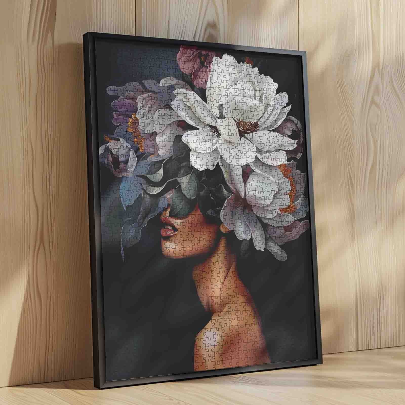 Une femme se tient de profil, le visage partiellement voilé par une cascade de fleurs blanches et un feuillage délicat. Les ombres profondes contrastent avec sa peau éclatante, tandis que chaque pétale semble vibrant de mouvement et de texture. L'image évoque à la fois mystère et grâce, comme si elle était une muse intemporelle, saisie dans un instant de force tranquille. Parfait pour ceux qui apprécient la mode, les fleurs et l'art moderne avec une touche d'élégance.