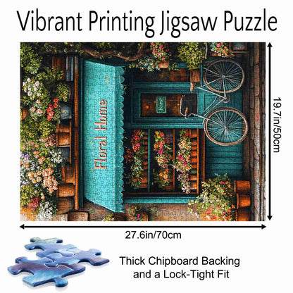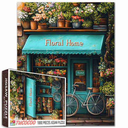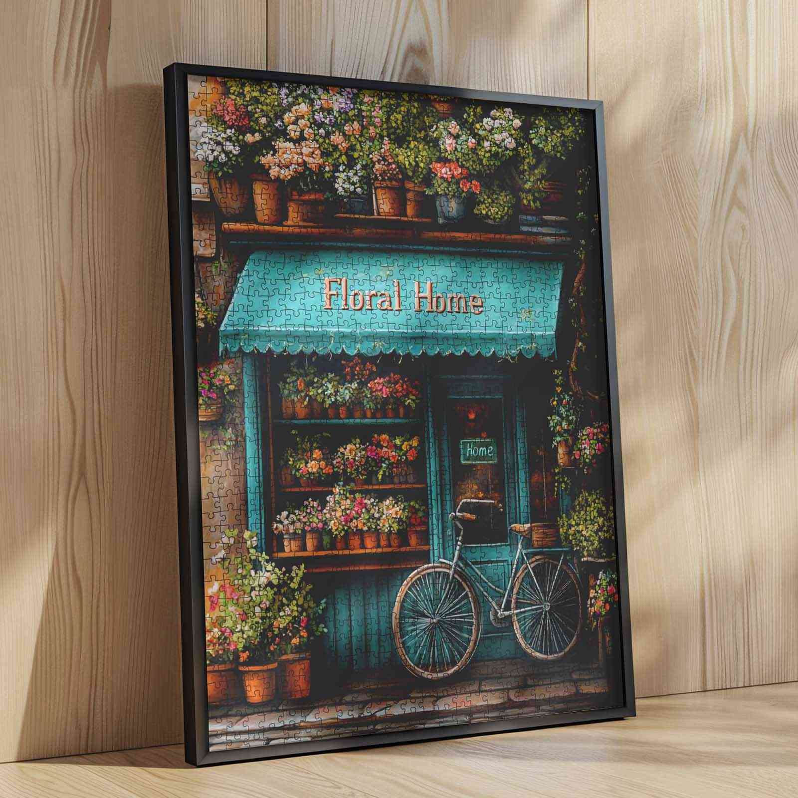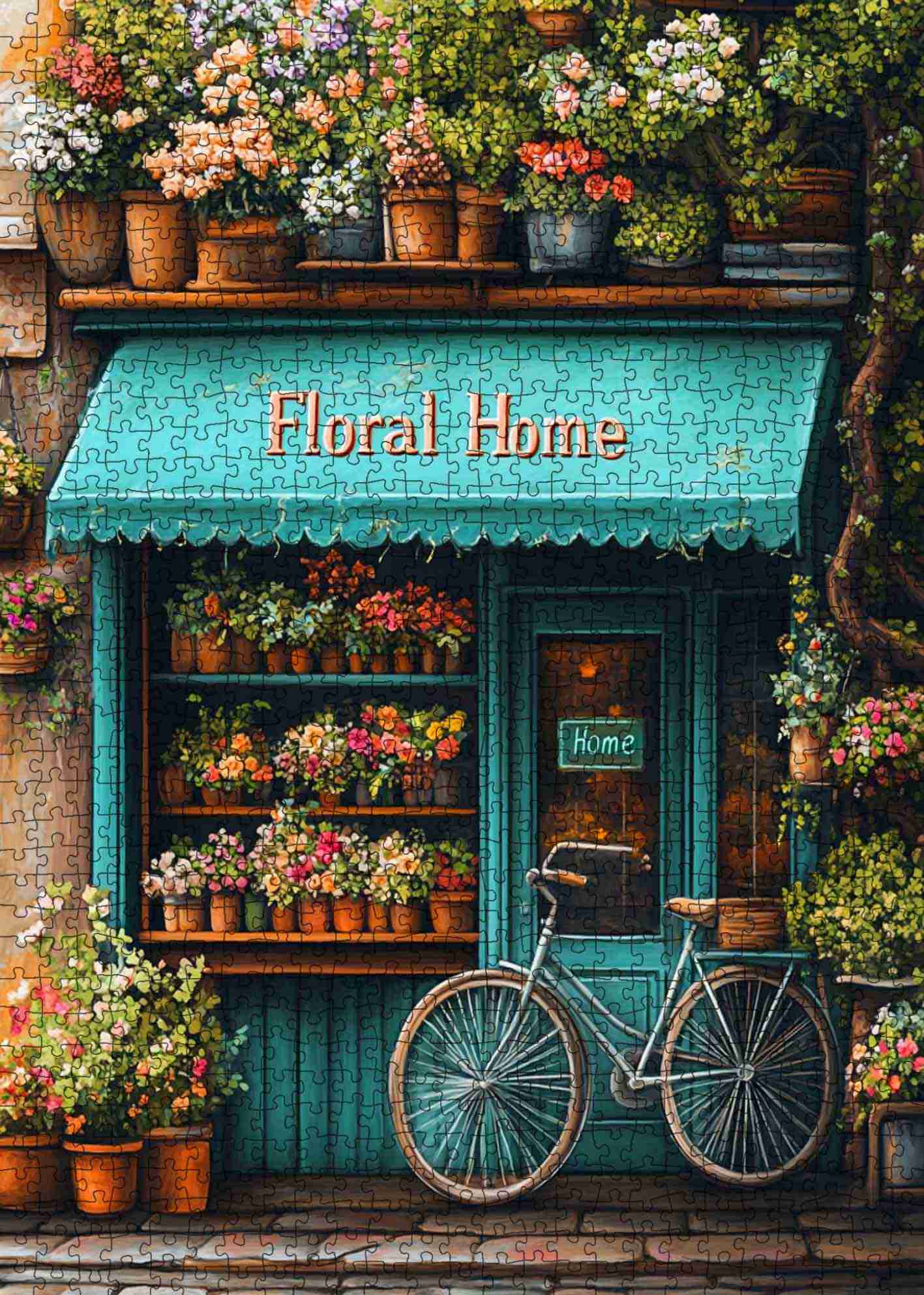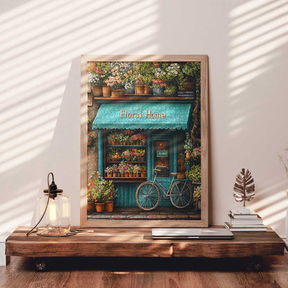 Nichée au coin d'une rue tranquille, une charmante boutique de fleurs déborde de vie. Des fleurs en pot de toutes les couleurs jaillissent des étagères en bois, baignées d'une lumière dorée. Au-dessus de la porte, l'enseigne « Floral Home » est une invitation chaleureuse. Un vélo vintage bleu sarcelle se penche doucement devant la porte, son panier prêt à accueillir un bouquet frais. Des plantes grimpantes s'enroulent et grimpent le long des murs, adoucissant les contours de la boutique et transformant la devanture en un tableau vivant. Chaque pièce ajoute une touche de calme, de couleur et cette nostalgie d'une paisible promenade d'après-midi.