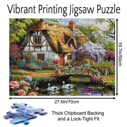 Nichée au cœur d'une forêt luxuriante, une charmante maisonnette au toit de chaume se niche au milieu de massifs fleuris et de plantes grimpantes. Un pont de bois enjambe un ruisseau paisible, où des oies blanches glissent paisiblement, se reflétant dans l'eau claire. Le jardin déborde de couleurs : roses, glycines et fleurs sauvages encadrent le chemin menant à la porte d'entrée chaleureuse. Chaque pièce du puzzle crée une évasion intemporelle, vous invitant dans un monde de conte de fées empreint de nature, de paix et de beauté bucolique.