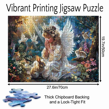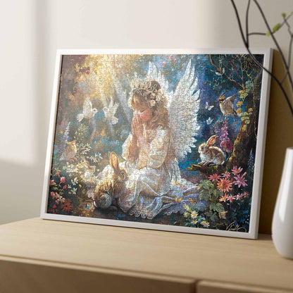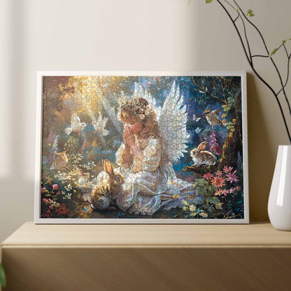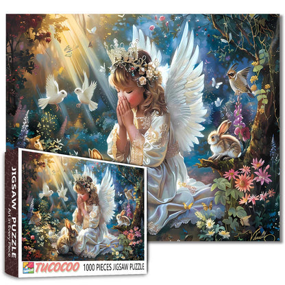 Entrez dans un monde serein avec notre puzzle Forest Prayer Angel. Ce puzzle enchanteur de 1000 pièces représente un jeune ange, vêtu d'une robe blanche et d'une couronne de fleurs, priant au milieu d'une forêt regorgeant d'animaux sauvages. Sa présence éthérée est entourée de lumière, avec des animaux doux comme des lapins et des oiseaux partageant ce moment paisible. L'illustration riche et détaillée capture une scène magique qui évoque un sentiment de tranquillité et d'émerveillement, ce qui la rend parfaite pour ceux qui chérissent les moments de calme et de réflexion et la beauté de la nature.