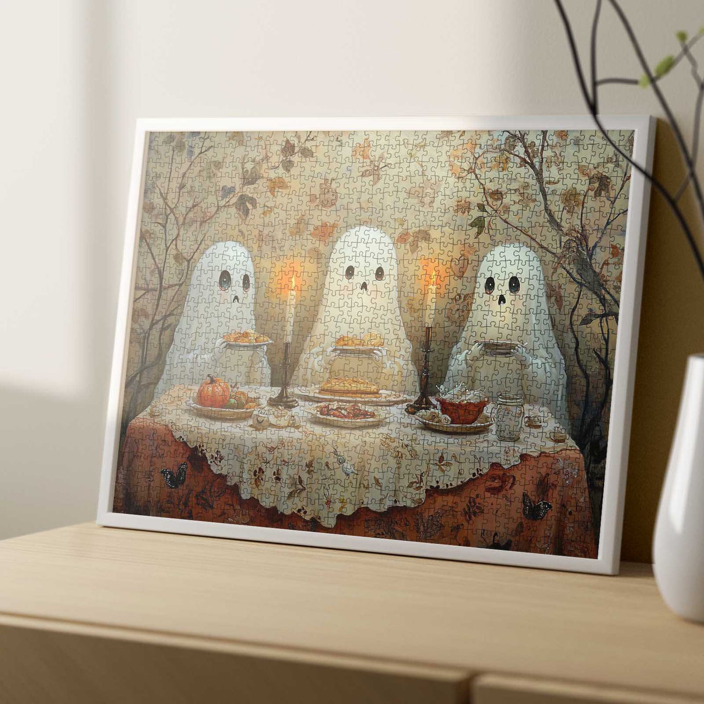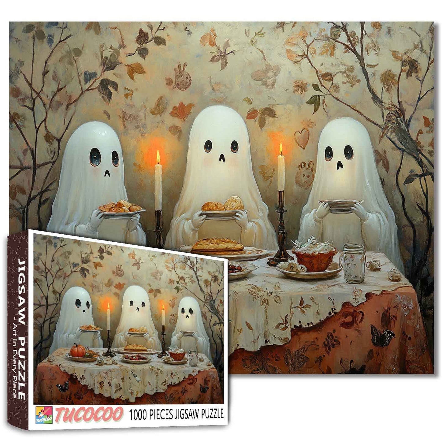 Trois adorables fantômes se réunissent autour d'un festin d'automne chaleureux, à la lueur des bougies et entourés de gourmandises festives. Ce charmant puzzle capture un moment réconfortant d'Halloween, parfait pour les amateurs de puzzles de tous âges. Complétez-le pour une décoration de saison magique ou un défi amusant !