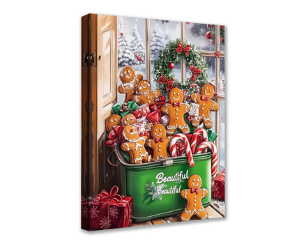 Cette toile joyeuse présente une présentation festive de biscuits au pain d'épices, de cannes à sucre et de cadeaux débordant d'une boîte à thème de vacances près d'une fenêtre. Une belle couronne et un paysage enneigé à l'extérieur complètent cette scène de Noël chaleureuse. Parfaite pour ajouter une touche douce et joyeuse à votre décor, cette œuvre d'art est idéale pour tous ceux qui aiment la chaleur et la fantaisie des friandises des Fêtes.