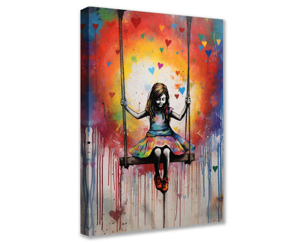 - Cette toile graffiti enchanteresse représente une jeune fille sur une balançoire, entourée d'une explosion de couleurs vives et de formes de cœur ludiques. L'expression joyeuse de son visage et le mélange dynamique de rouges, de jaunes et de bleus créent une atmosphère chaleureuse et exaltante. Parfaite pour ajouter une touche de fantaisie et de charme street art à n'importe quel espace, cette pièce rayonne de bonheur et d'innocence, ce qui en fait un point focal captivant pour votre décor.