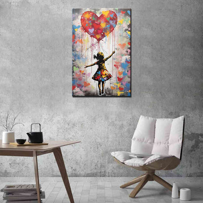 - Cette toile de graffiti saisissante représente une jeune fille qui attrape joyeusement un gros ballon en forme de cœur. Les touches de couleurs vives en arrière-plan créent une scène urbaine onirique pleine d'énergie et de vie. Avec des gouttes de peinture et un mélange ludique de cœurs, cette œuvre apporte un mélange d'innocence et de style street art, ajoutant une touche de personnalité à n'importe quelle pièce.
