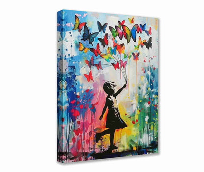 Cette charmante toile graffiti représente une jeune fille tenant un bouquet de papillons vibrants comme des ballons, sur un fond abstrait coloré. Le mélange ludique de papillons et de gouttes de peinture ajoute une touche éthérée, tandis que le contraste de la silhouette de la fille apporte concentration et profondeur. Parfaite pour ajouter de la fantaisie et du charme, cette pièce transforme n'importe quel espace avec son style vivant inspiré de Banksy.