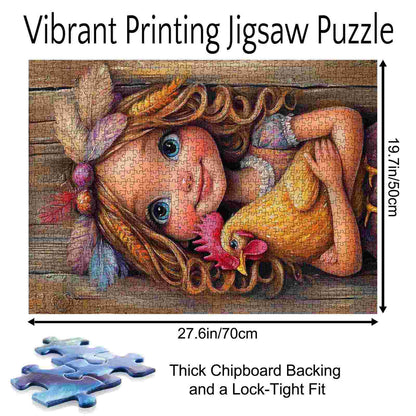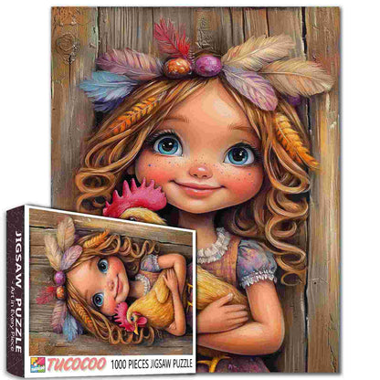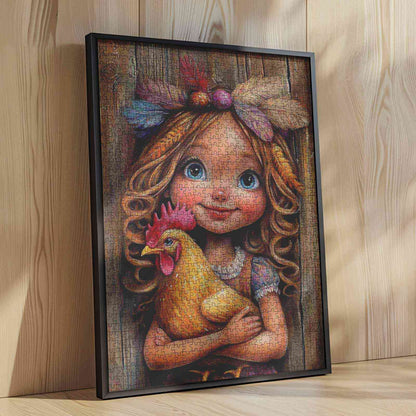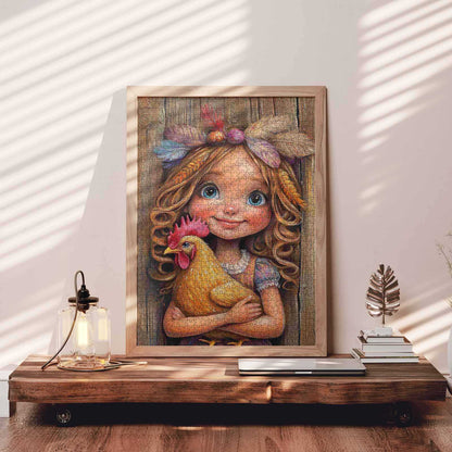 Une jeune fille joyeuse aux cheveux bouclés et à la couronne de plumes sourit chaleureusement en tenant un coq jaune. Le fond en bois rustique et les douces couleurs naturelles rehaussent la chaleur de cette scène enchanteresse. Les yeux bleu vif de la jeune fille et les plumes éclatantes du coq créent un contraste touchant, tandis que les plumes qui l'entourent dans ses cheveux ajoutent une touche de fantaisie à la scène. Ce puzzle est parfait pour ceux qui apprécient les images charmantes et rustiques et les personnages fantaisistes, ce qui en fait un défi passionnant pour les amateurs de puzzles de tous âges.