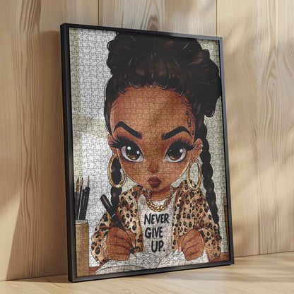 Une jeune fille est assise à son bureau, confiante, vêtue d'une veste léopard tendance et portant le message audacieux « Never Give Up » sur son t-shirt. L'air concentré, elle écrit dans son carnet, entourée de stylos et de crayons, affichant sa détermination et son esprit créatif. Ce puzzle inspirant est parfait pour tous ceux qui ont besoin d'un rappel pour rester forts et persévérer, quels que soient les défis. Idéal pour les amateurs de puzzles et tous ceux qui ont besoin d'un regain de motivation.