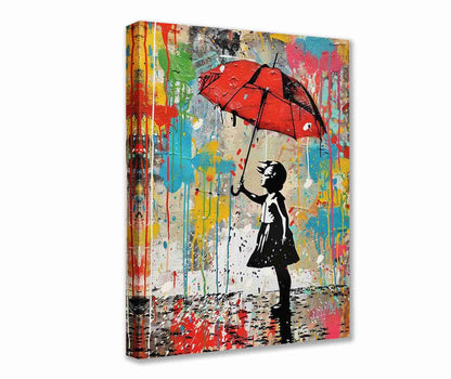 Cette toile graffiti de style Banksy représente une jeune fille avec un parapluie rouge vif, debout au milieu d'une éclaboussure colorée de gouttes de peinture et de traits abstraits. Sa silhouette ressort sur le fond animé, créant un sentiment d'innocence au milieu du chaos urbain. Cette œuvre apporte le charme audacieux du street art dans votre maison, ce qui en fait une déclaration de décoration audacieuse.