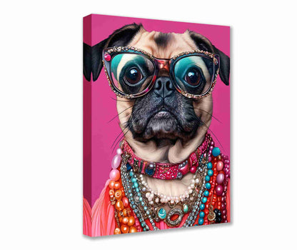 Toile murale représentant un carlin glamour portant des bijoux et des lunettes