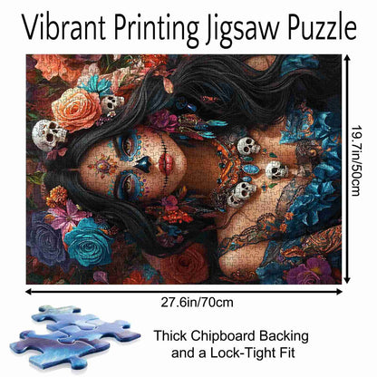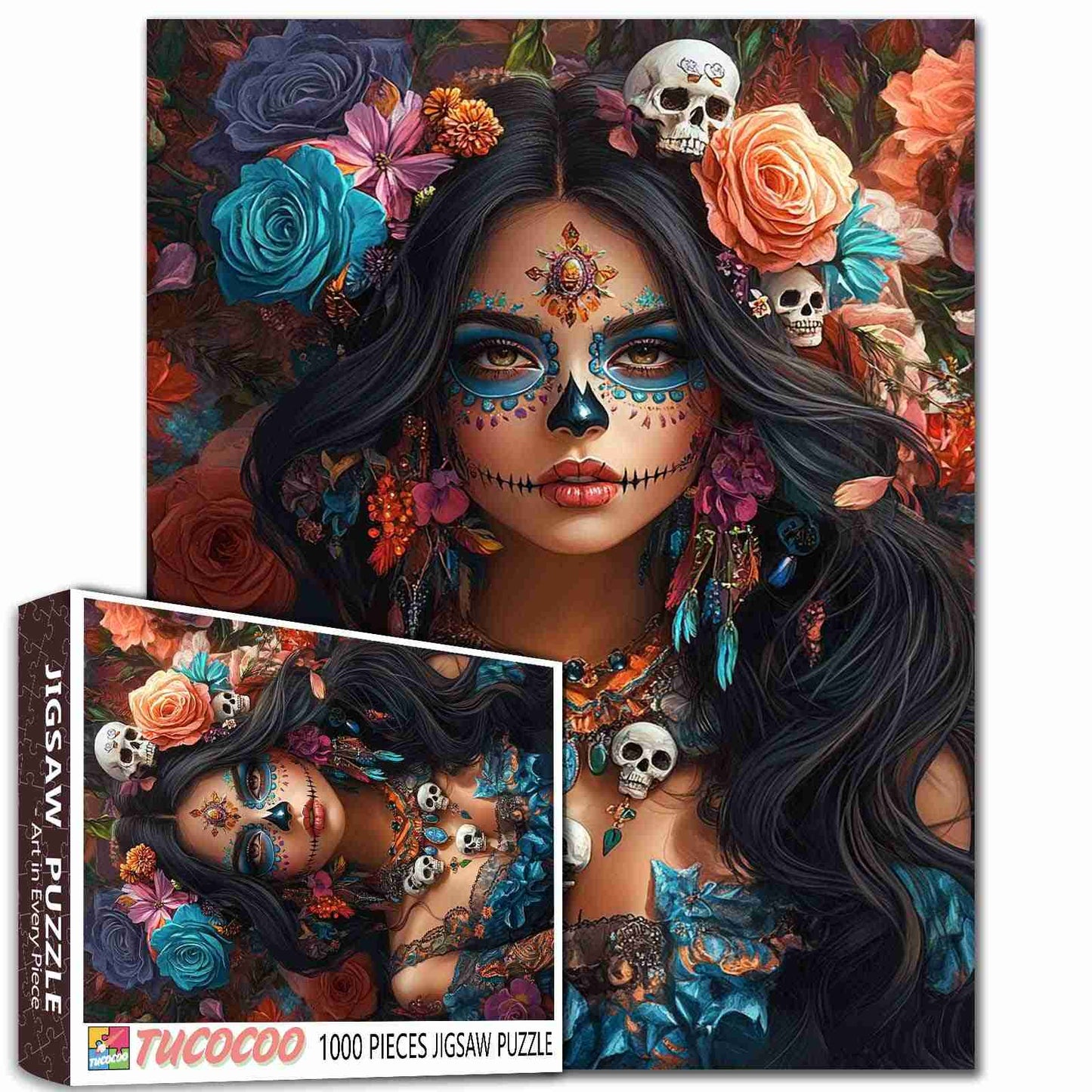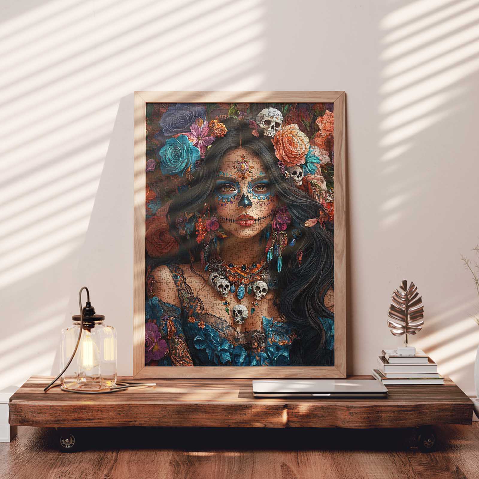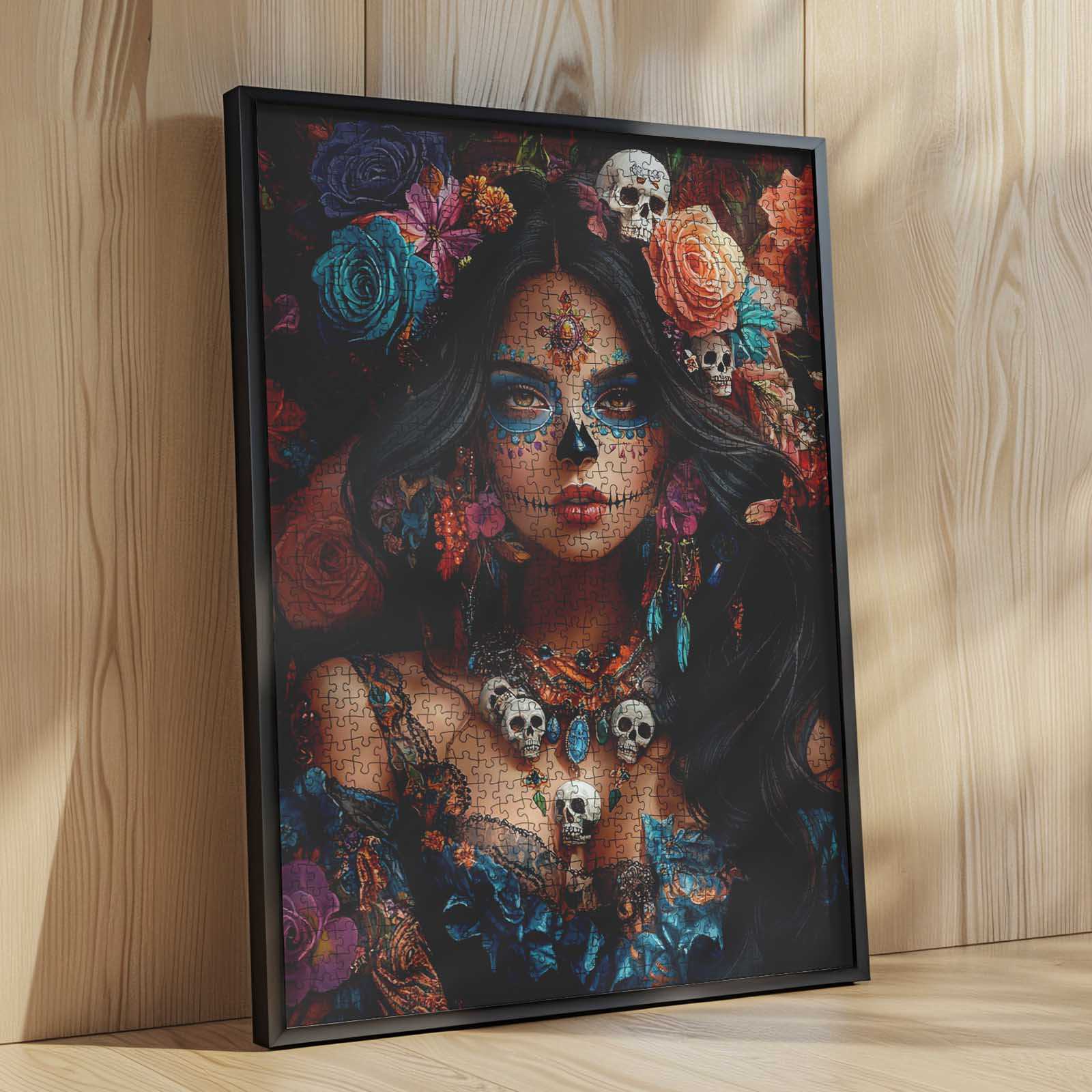 Parée de roses éclatantes et d'un maquillage détaillé en forme de crâne en sucre, cette femme magnifique rayonne de puissance et de mystère. Son regard intense, entouré de riches textures, de plumes et de bijoux, évoque l'esprit du Día de los Muertos. Pièce par pièce, découvrez un monde de beauté culturelle et d'élégance gothique dans cette expérience de puzzle fascinante.