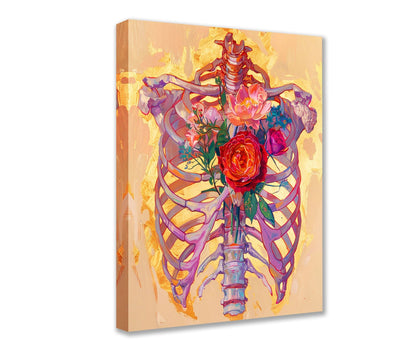 Une fusion étonnante d'anatomie et d'art, cette toile met en valeur une cage thoracique dorée entrelacée de roses en fleurs et de verdure luxuriante. Le fond doré chaleureux met en valeur les teintes florales vibrantes, créant un visuel fascinant de la beauté émergeant de l'intérieur. Parfait pour ajouter un charme symbolique à votre décor.