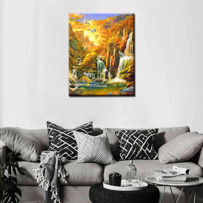 Embrassez la chaleur d'un coucher de soleil doré avec notre peinture par numéros Golden Sunset Waterfall. Cette scène à couper le souffle présente des cascades baignées de lumière dorée, avec une végétation luxuriante et d'élégantes grues s'élevant dans le ciel. Parfait pour les amoureux de la nature, ce tableau capture la tranquillité et la beauté d'un paradis éclairé par le coucher du soleil.