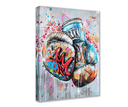 Cette œuvre d'art graffiti énergique présente des gants de boxe recouverts de tags et d'éclaboussures vibrantes, symbolisant la force, la résilience et le courage urbain. La peinture en aérosol colorée et les traits dynamiques donnent vie aux gants, ce qui en fait une pièce puissante pour tout décor. Parfaite pour les fans de street art et de boxe, cette toile ajoute une ambiance audacieuse et avant-gardiste à votre espace. Imaginez ces gants sur votre mur, représentant la détermination et la volonté de surmonter, le tout avec une touche de graffiti moderne.