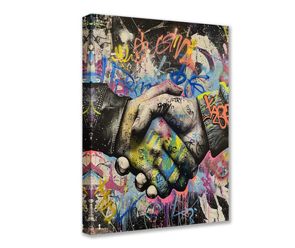 Cette puissante œuvre d'art graffiti capture une poignée de main audacieuse, symbolisant l'unité et la confiance, avec des tags de rue vifs et des touches de couleur. Le style d'art urbain expressif en fait un ajout unique à tout espace, alliant force et collaboration. Parfaite pour les amateurs de décoration moderne et les fans de street art, cette toile sera un point focal saisissant, ajoutant de la personnalité et du caractère.