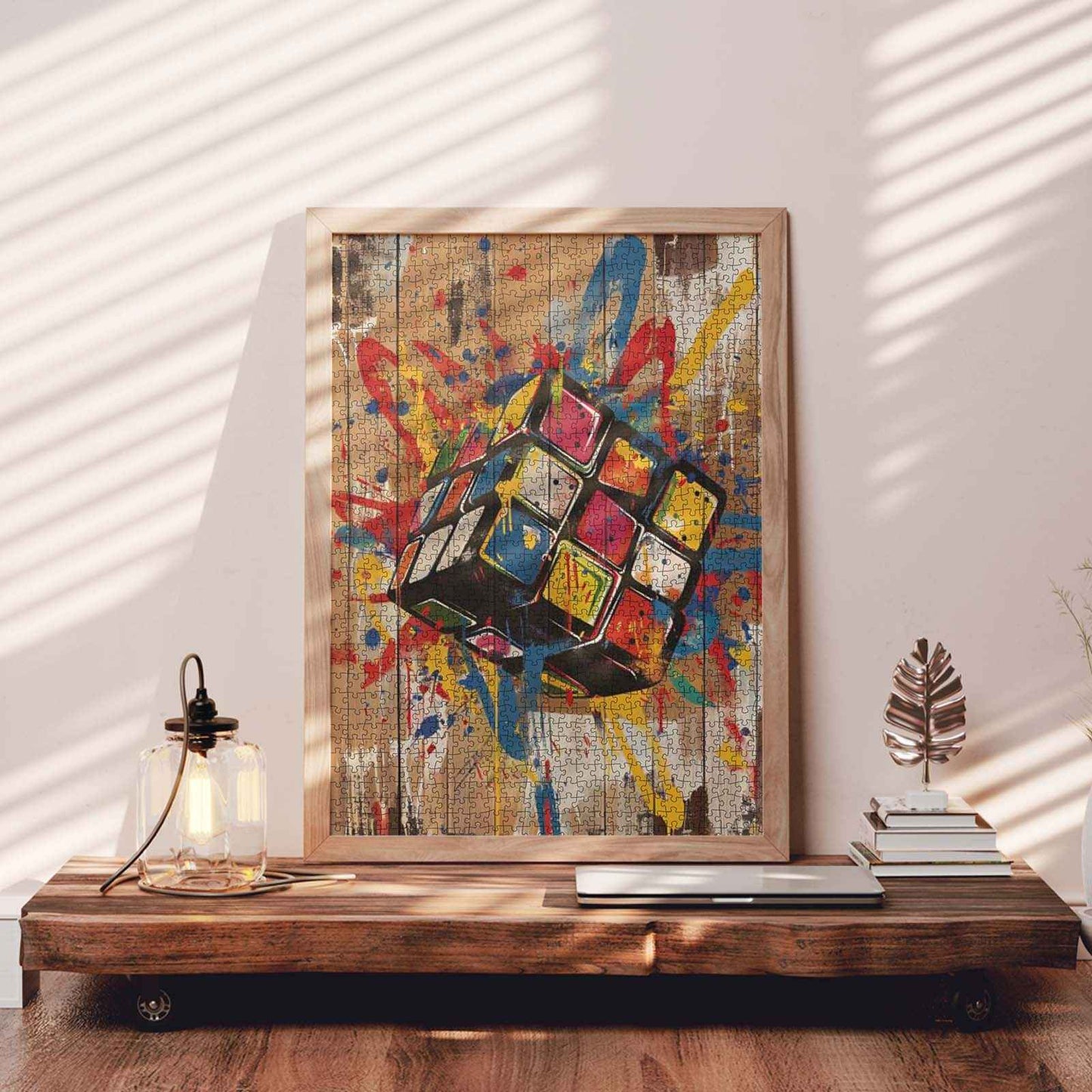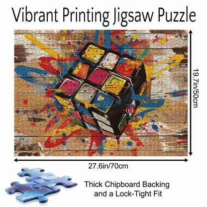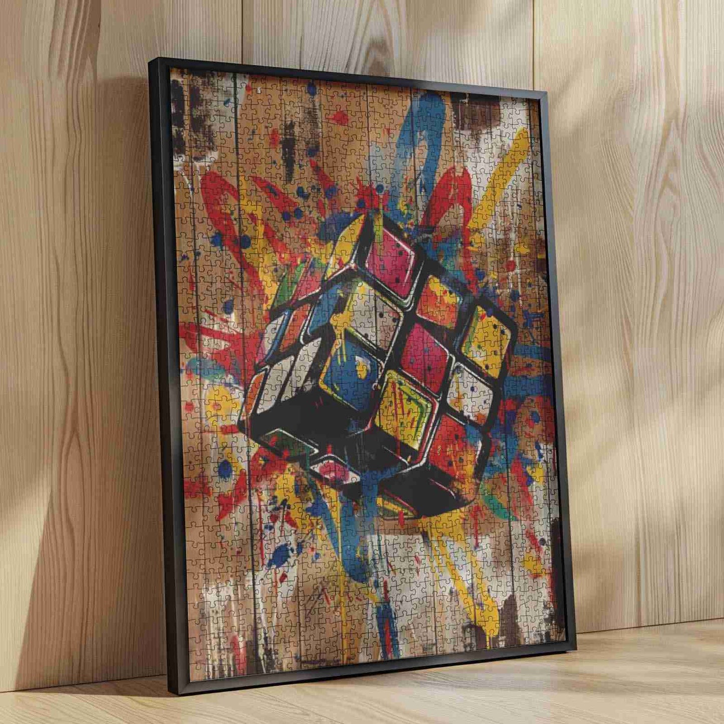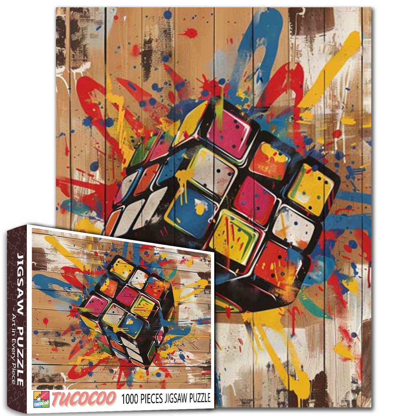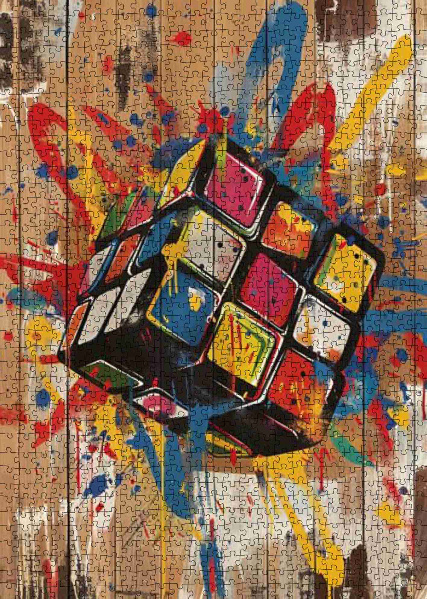 La logique rencontre le chaos dans ce puzzle coloré et percutant. Un Rubik's Cube flotte dans les airs, entouré d'éclaboussures de peinture bleue, rouge, jaune et orange, tel un casse-tête pris dans une explosion de street art. Chaque tour du cube résonne d'une énergie créatrice brute. Avec ses traits audacieux et son fond texturé en bois, ce puzzle est un hommage ludique aux jeux d'esprit et au style urbain moderne.