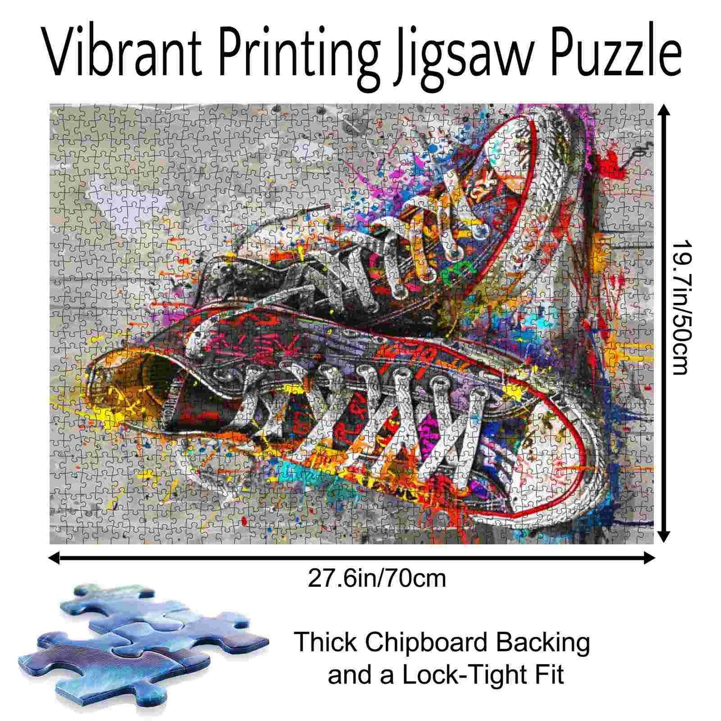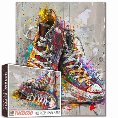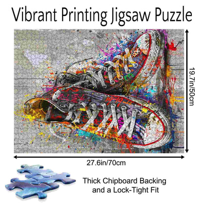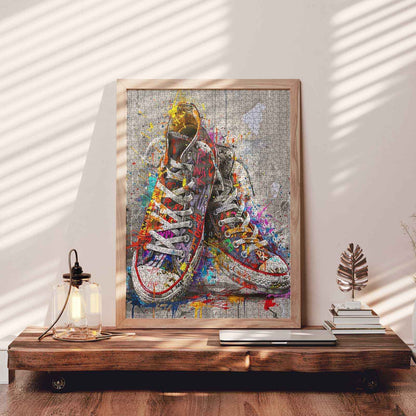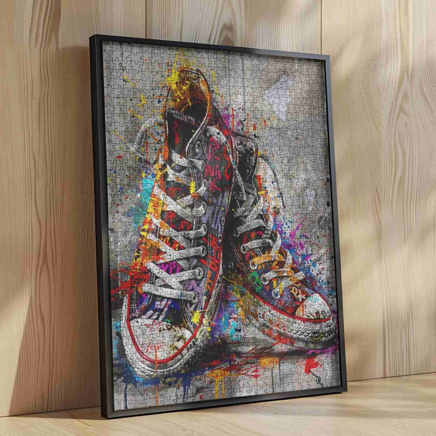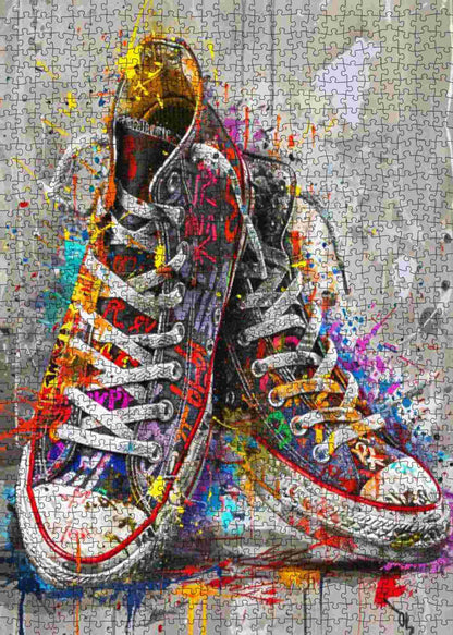 Adoptez le style urbain avec ce puzzle audacieux et audacieux. Une paire de baskets montantes usées trône au centre, couverte de graffitis éclatants, d'éclaboussures de peinture fluo et de traces de la vie urbaine. Chaque pièce capture un détail de l'expression rebelle, des semelles en caoutchouc éraflées aux superpositions de couleurs sur la toile. Ce puzzle est une déclaration d'amour à l'expression de soi, à la nostalgie et à la culture de la rue.