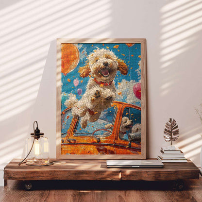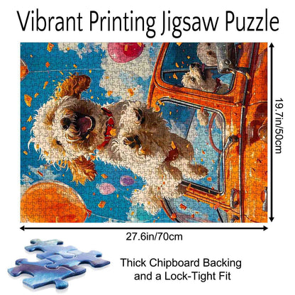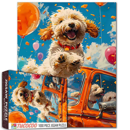 - Ce puzzle coloré représente un chien heureux sautant d'une voiture avec des ballons dans le ciel. Les couleurs vives et le design fantaisiste apporteront de la joie à votre maison. C'est un puzzle amusant et stimulant pour les adultes comme pour les enfants !