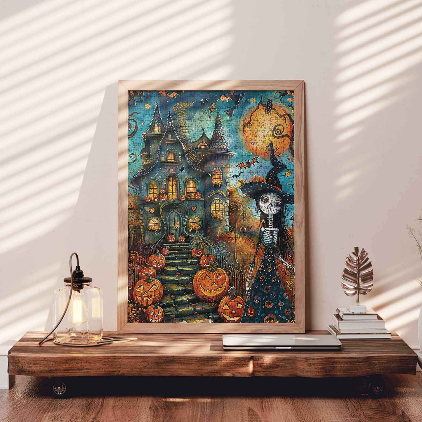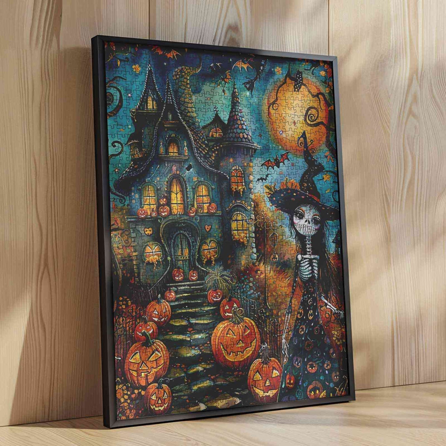 Une maison tordue et fantaisiste brille chaleureusement sous une lune de pleine lune, tandis que des citrouilles-lanternes éclairent le chemin sinueux. Une silhouette élancée, vêtue d'une robe fluide à motifs de citrouilles, se tient à proximité, mêlant charme effrayant et joie festive. Au-dessus, chauves-souris et sorcières s'envolent dans le ciel tourbillonnant de l'automne. Chaque pièce capture l'esprit ludique de la nuit d'Halloween, vous invitant à pénétrer dans ce monde vivant et enchanté.