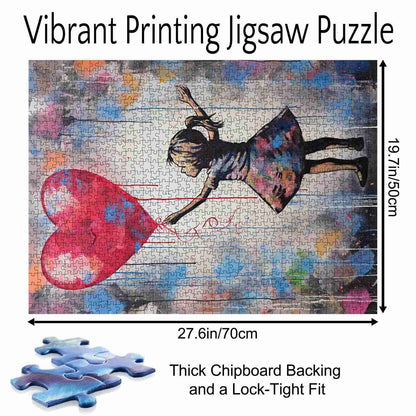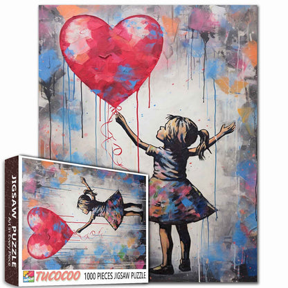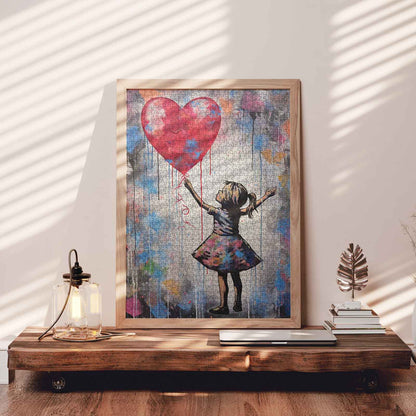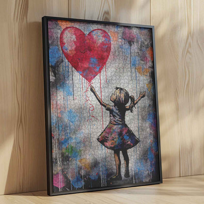 Une jeune fille, émerveillée, tient un ballon en forme de cœur dans ses mains, entourée de couleurs vibrantes, dans un spectacle fascinant de beauté, digne d'un graffiti. Les bras tendus, le ballon flotte vers le ciel, symbolisant l'innocence de l'enfance et les possibilités infinies qui l'attendent. Les traînées de peinture colorées qui s'étalent sur le fond ajoutent une touche de liberté et d'énergie à ce moment touchant. En reconstituant ce puzzle, vous revivrez la joie et l'espoir que cette scène incarne, ce qui en fait une pièce idéale pour les amateurs de puzzles de tous âges, qui pourront s'y plonger et se connecter à l'énergie positive de l'œuvre.