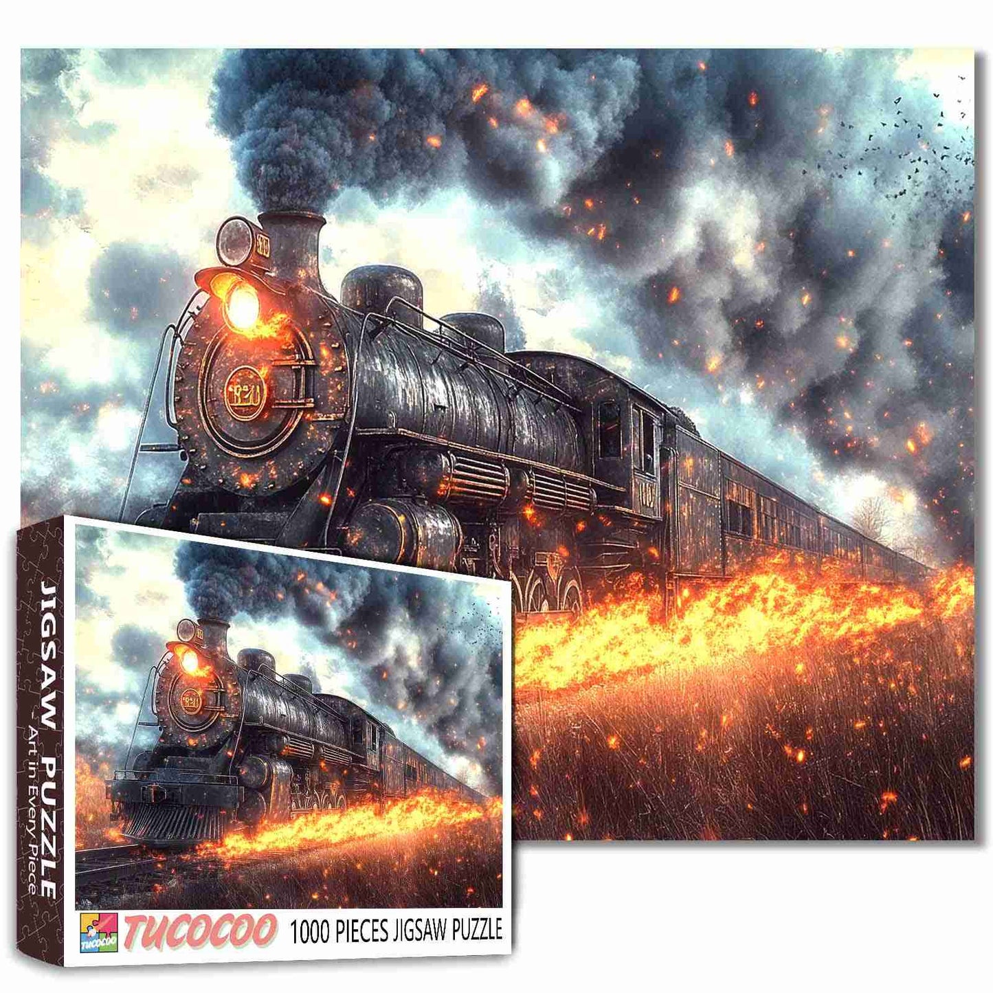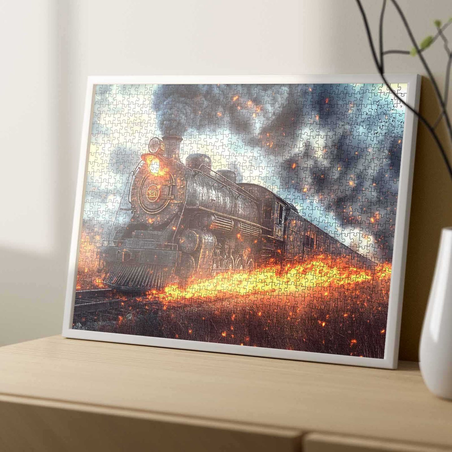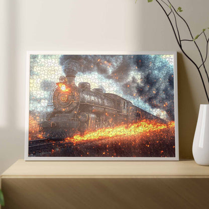 Une puissante locomotive à vapeur dévale les rails avec fracas, sa structure en fer rougeoyant de braises, fendant le feu et la fumée. Des flammes jaillissent sous ses roues, tandis que des étincelles illuminent le ciel orageux, transformant le trajet du train en un embrasement spectaculaire de mouvement et de puissance. Chaque pièce capture la force brute de cette bête invincible, fonçant comme une légende forgée dans la chaleur et l'acier. Plus qu'un simple train, c'est un symbole d'élan, de force et de frisson. Un puzzle qui rugit avec intensité et émerveillement.