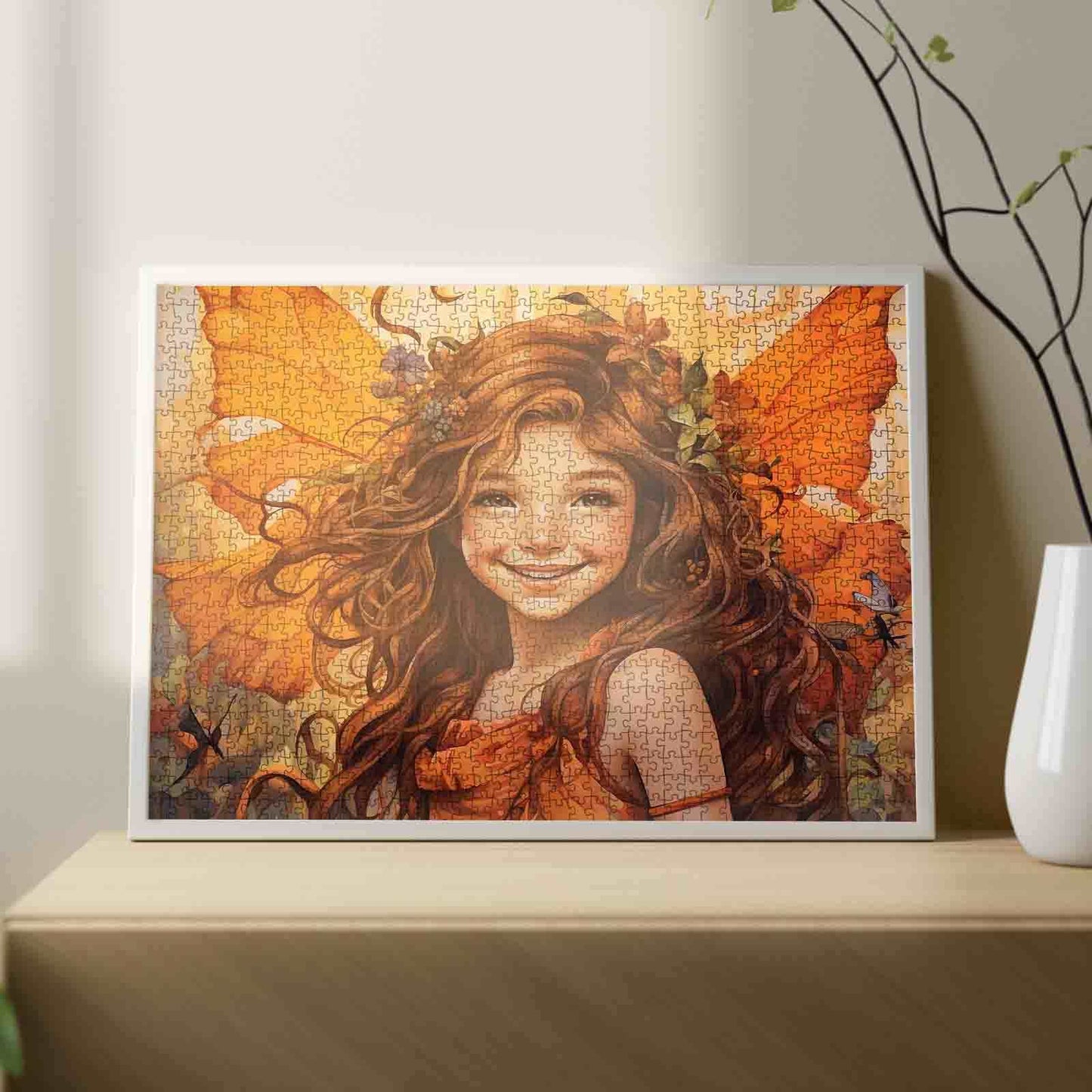 Baignée de lumière dorée, une fée aux boucles ondulantes et à la couronne de fleurs des bois rayonne de bonheur. Ses ailes orange vif captent le soleil tandis qu'elle rayonne de joie dans une clairière enchantée. Des papillons qui voltigent autour d'elle à l'étincelle chaleureuse qui brille dans ses yeux, chaque détail raconte une histoire de joie, de liberté et de magie de la nature. Une escapade délicieuse pour les rêveurs comme pour les amateurs de puzzles.