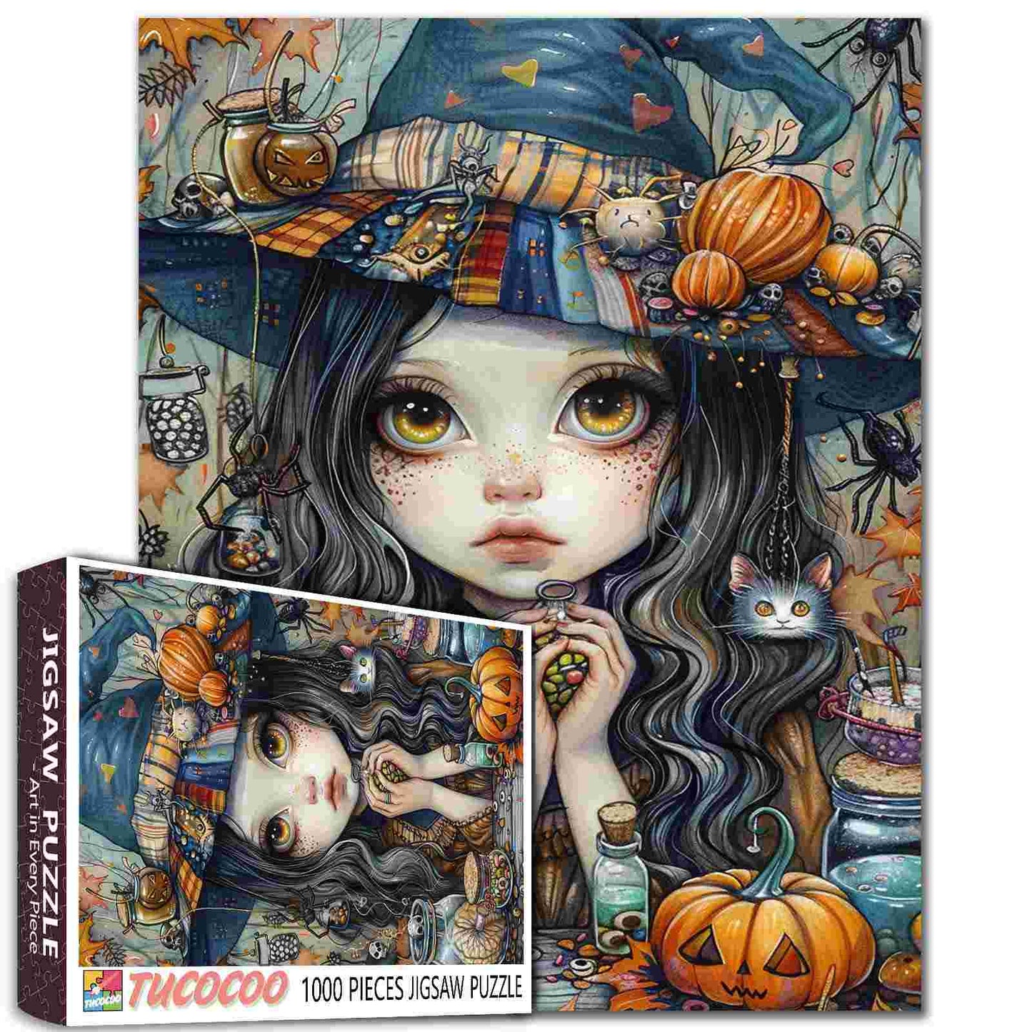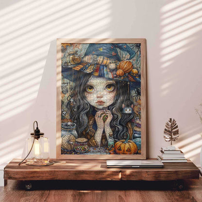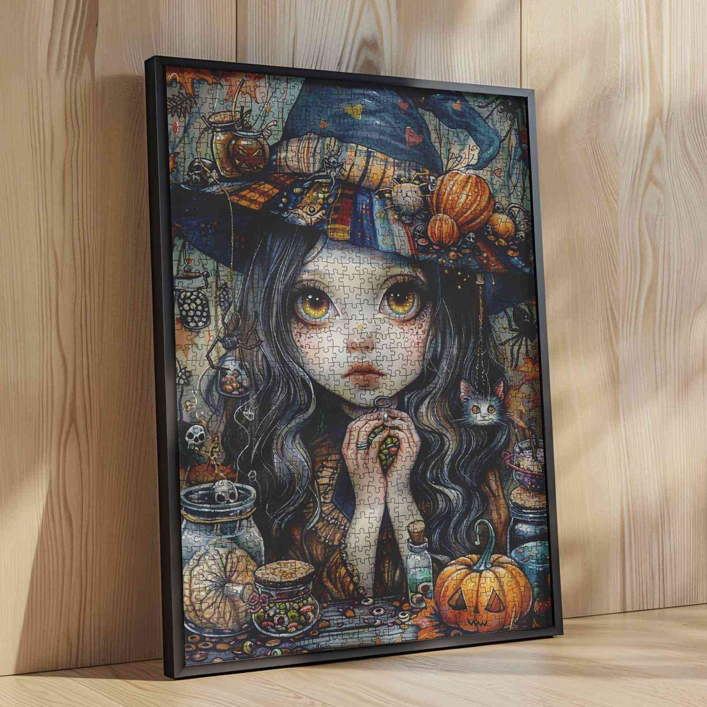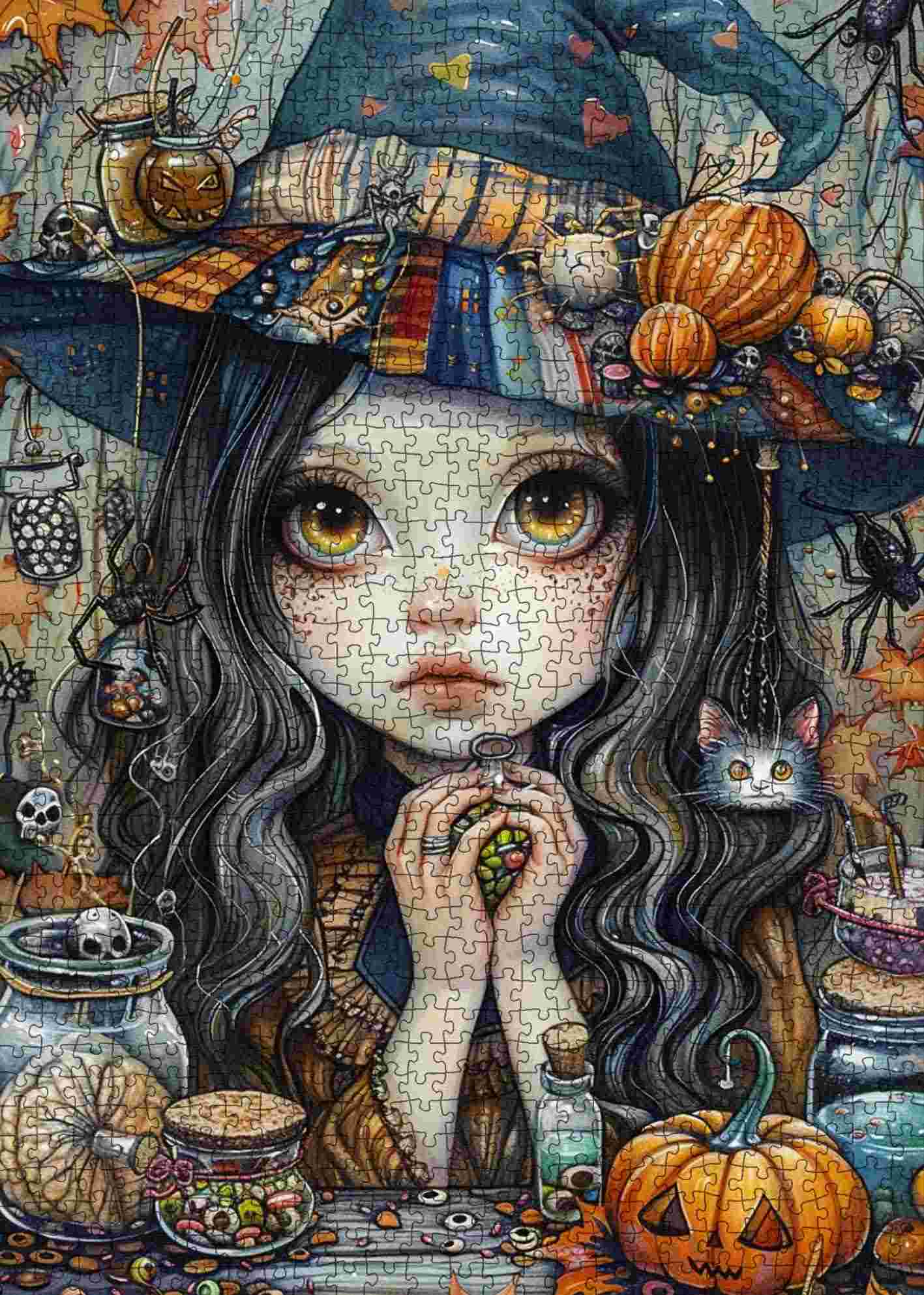 Dans un monde peuplé de sorts et de potions, une petite sorcière serre contre son cœur un charme mystérieux. Ses grands yeux brillants laissent entrevoir des aventures secrètes qui se préparent sous la lune d'automne. Autour d'elle, de minuscules citrouilles, des bocaux lumineux et un chat espiègle créent une scène débordante de magie d'Halloween. Chaque pièce évoque le charme d'une soirée magique.