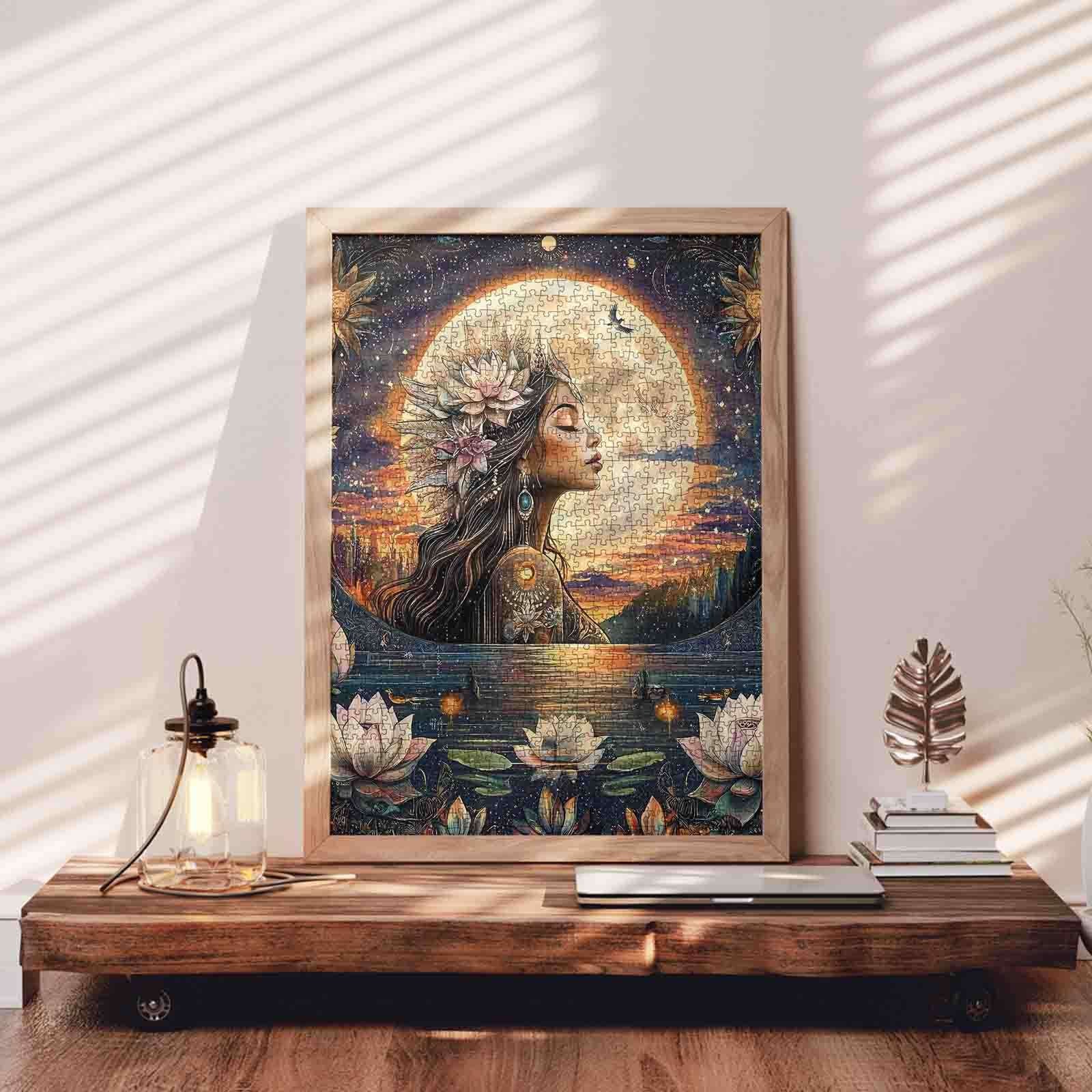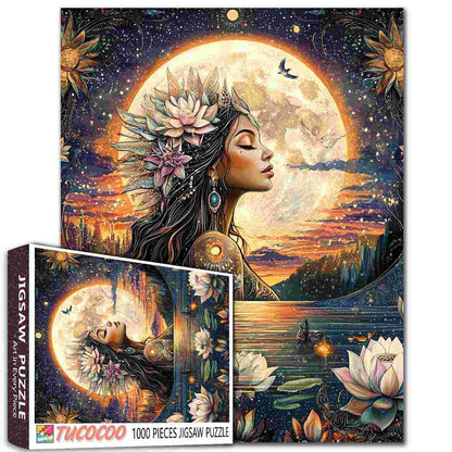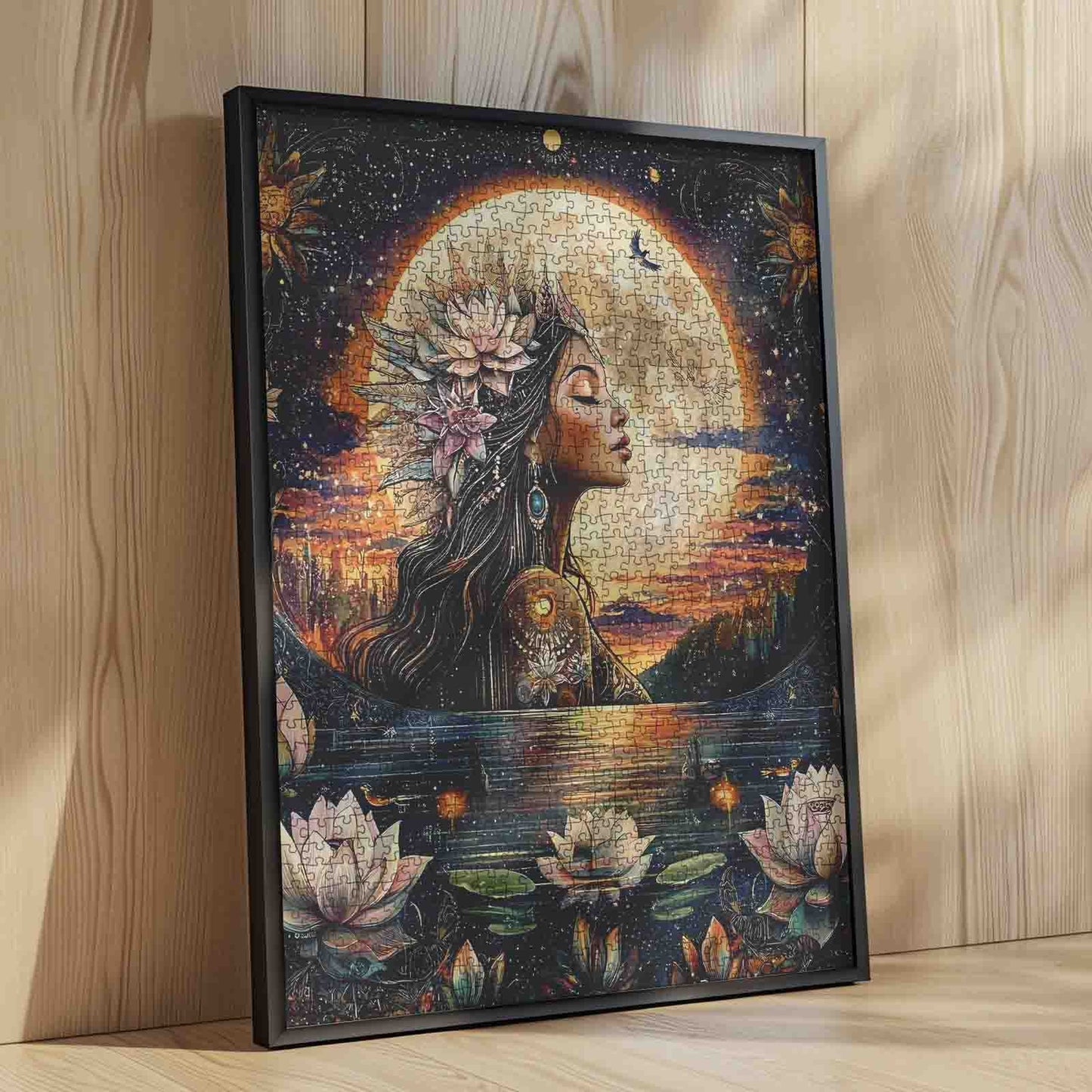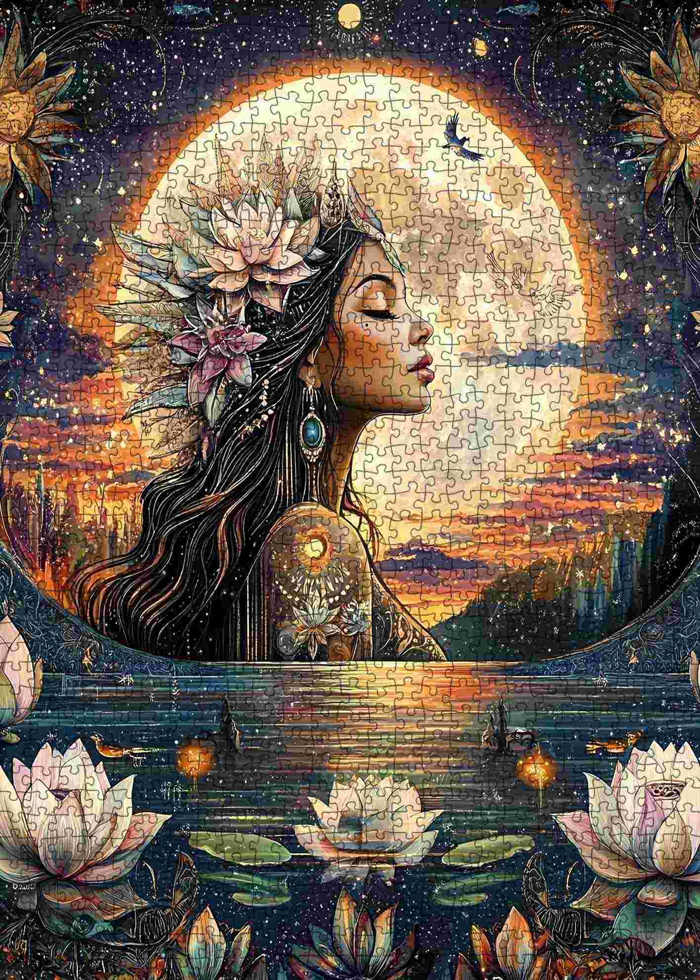 Baignée de clair de lune, une déesse sereine, couronnée de lotus, se tient au bord d'un lac scintillant. Ses yeux clos suggèrent une connexion profonde avec l'univers, tandis que des lanternes flottent doucement et que les étoiles scintillent au-dessus de sa tête. Un puzzle empreint de force tranquille, de mystère et de beauté céleste.