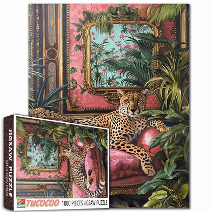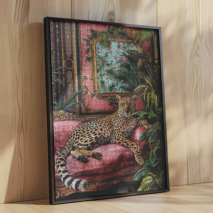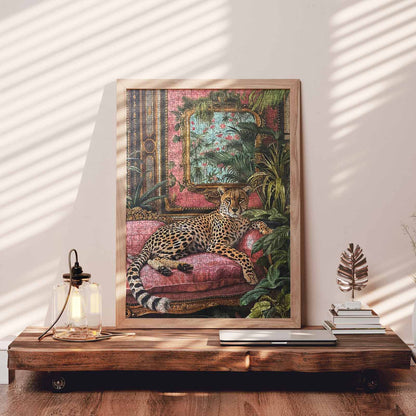 Un guépard élégant se prélasse gracieusement sur un somptueux canapé rose, entouré d'une végétation luxuriante et d'un décor doré. Les détails complexes et l'atmosphère royale créent une expérience de puzzle captivante pour les amateurs de faune et de luxe.