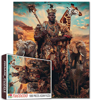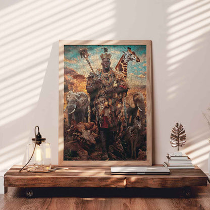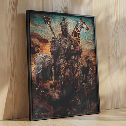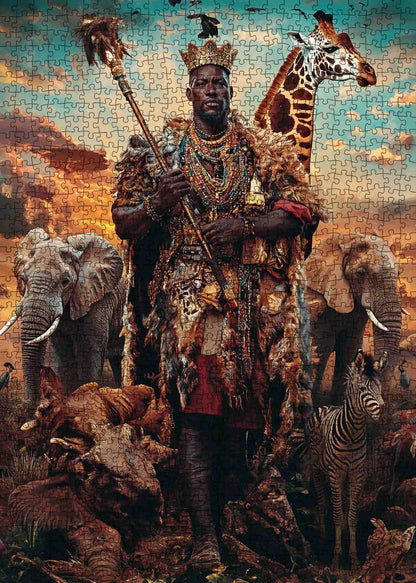 Se dressant fièrement au milieu de la nature sauvage, ce puissant roi est paré de perles éclatantes et de bijoux raffinés, incarnant l'esprit de la savane africaine. Entouré d'une faune majestueuse comme les éléphants, les girafes et les zèbres, sa présence respire la force et la grâce. Le coucher de soleil flamboyant en arrière-plan offre un tableau saisissant de la beauté et de l'harmonie entre la nature et la royauté. Reconstituez ce tableau majestueux et captivant et ressentez le lien profond qui unit le roi à son royaume.