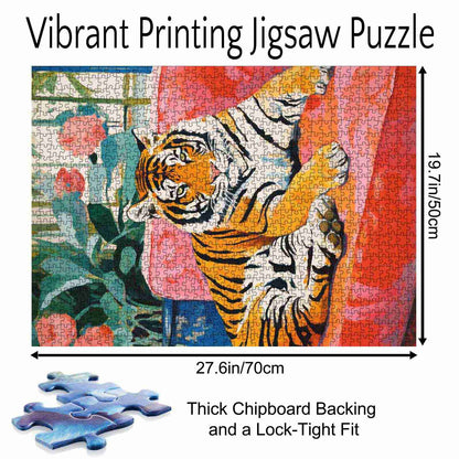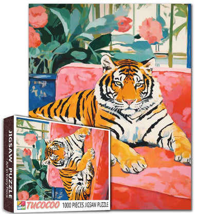 Un tigre majestueux est allongé sur un canapé rouge vif, dégageant force et élégance. Les couleurs vives et la végétation luxuriante en arrière-plan créent un contraste saisissant, rendant cette scène à la fois sauvage et sophistiquée. Chaque pièce du puzzle révèle la beauté de cet animal majestueux, offrant un défi artistique et captivant.
