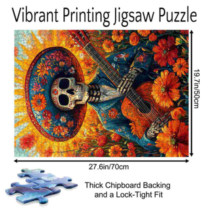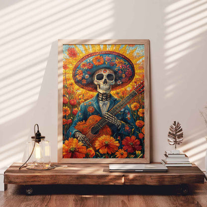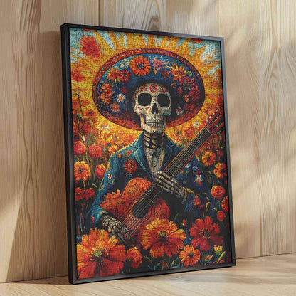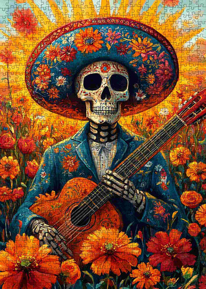 Plongez dans l'univers coloré du Jour des Morts avec ce puzzle captivant. Représentant un squelette vêtu d'un costume de mariachi éclatant, jouant de la guitare au milieu d'un champ de fleurs éclatantes, il donne vie à l'essence même de la culture mexicaine.