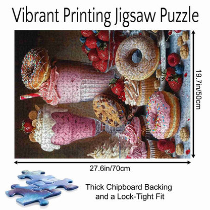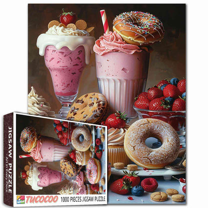 Plongez dans un paradis sucré avec les puzzles Milkshakes et Bonbons. Avec ses milkshakes mousseux, ses cupcakes, ses beignets et ses baies fraîches, ce puzzle est un régal délicieux pour les amateurs de desserts et un ajout sucré à n'importe quel espace.