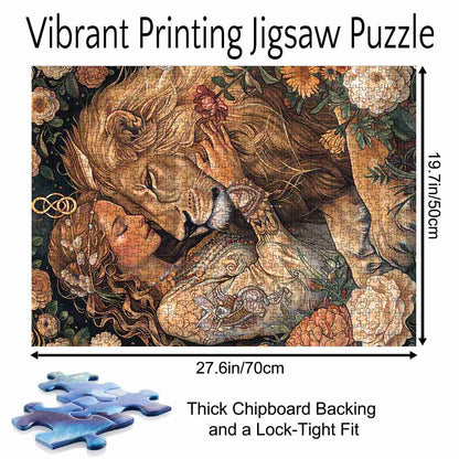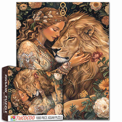 Plongez dans l'étreinte mythique de notre puzzle Mystical Lion and Maiden. Ce puzzle captivant de 1000 pièces représente un moment de tendresse entre une jeune fille sereine et un lion majestueux, entourés d'un décor floral luxuriant. L'illustration complexe présente des couleurs riches et chaudes et des éléments symboliques, véhiculant une histoire de courage, de confiance et de lien intime avec la nature. Idéal pour ceux qui sont enchantés par le symbolisme animal et le folklore romantique, ce puzzle offre un défi profond et visuellement époustouflant.