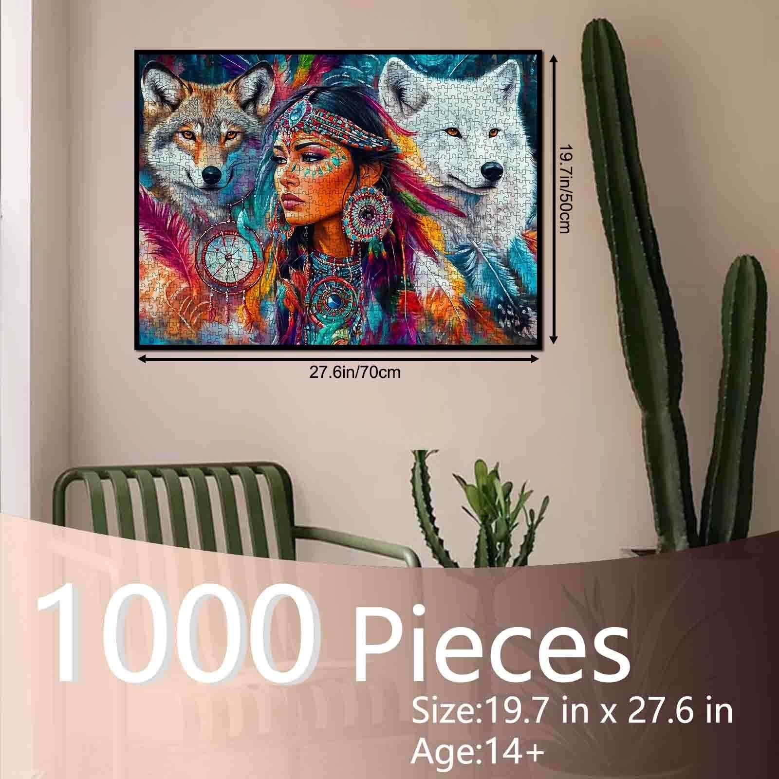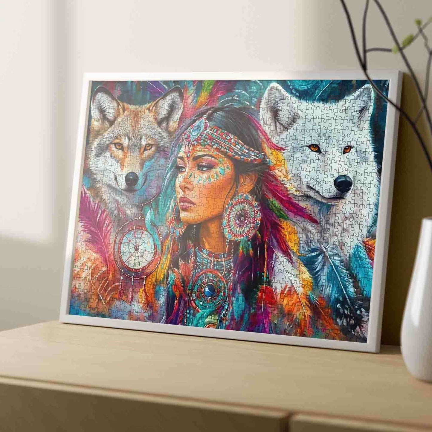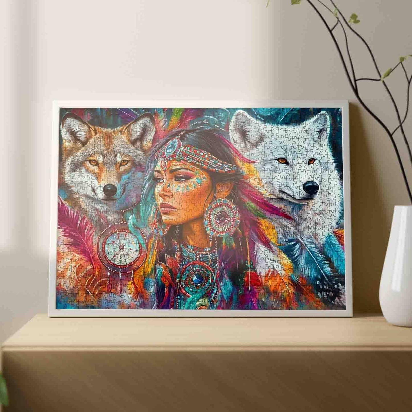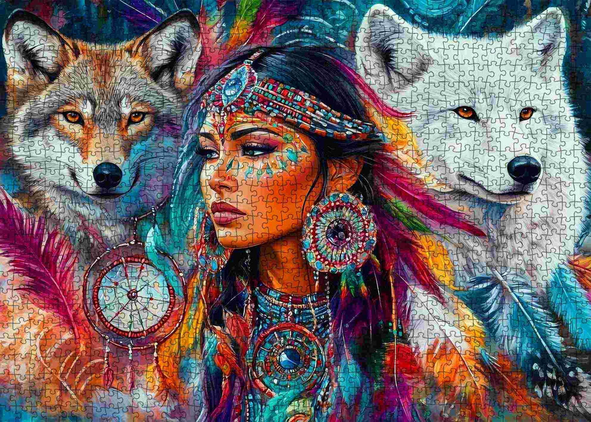 Plongez dans le monde enchanteur de la culture autochtone avec ce superbe puzzle. Mettant en vedette une femme captivante vêtue d'une tenue traditionnelle complexe, entourée de deux loups majestueux, cette œuvre d'art représente magnifiquement le lien entre l'humanité et la nature. Les plumes vibrantes, les détails de l'attrape-rêves et le regard puissant des loups créent une pièce inspirante pour les amateurs de puzzles et les passionnés d'art.