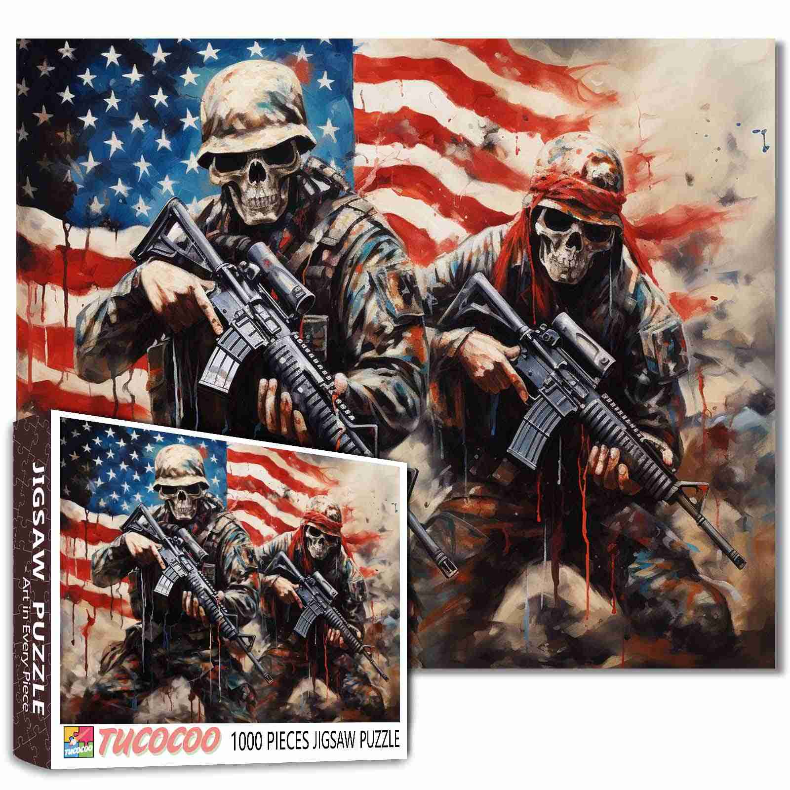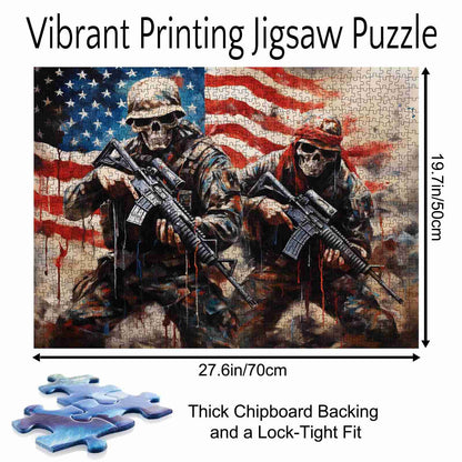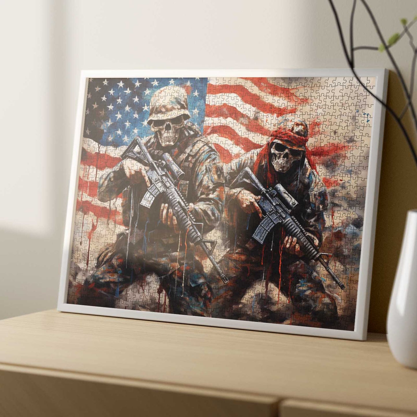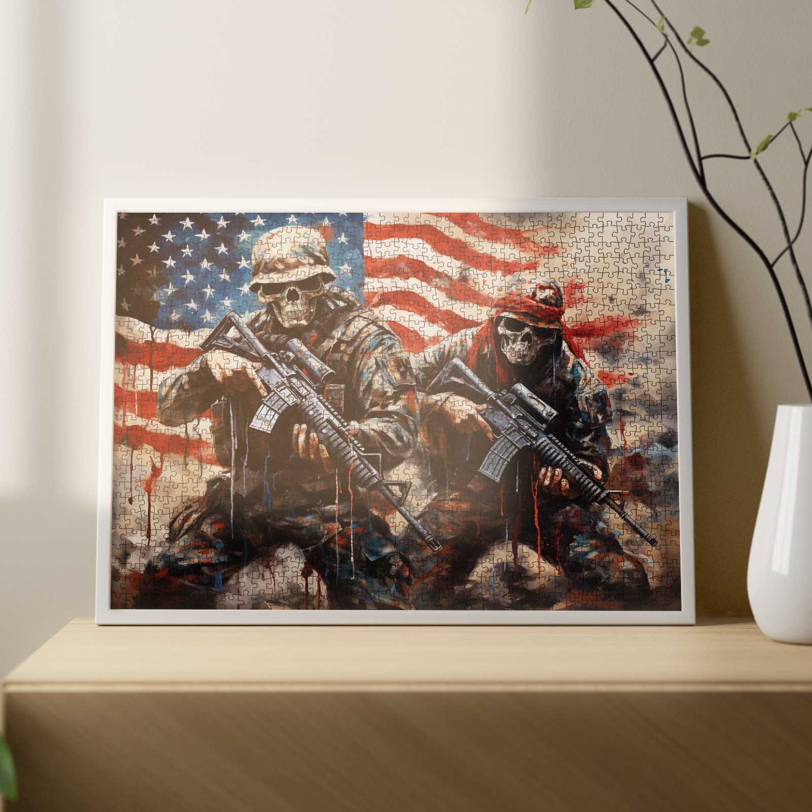 Deux soldats squelettiques se tiennent prêts sous le drapeau américain flottant, fusils à la main, les yeux dissimulés par des lunettes de soleil sombres. Leur posture respire la discipline et le défi, tandis que le décor ajoute une touche patriotique audacieuse. Ce puzzle capture un puissant mélange de loyauté et de rébellion, ce qui en fait une pièce remarquable pour les collectionneurs d'art audacieux et audacieux.