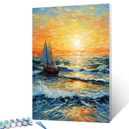 Naviguez vers la tranquillité avec ce kit de peinture par numéros, capturant un voilier unique glissant sur les vagues sous un ciel de coucher de soleil éclatant. Les traits texturés d'oranges chaudes, de jaunes doux et de bleus profonds donnent vie à ce paysage marin serein, ce qui en fait un choix idéal pour les artistes débutants et expérimentés qui cherchent à ajouter une décoration paisible à leur espace.