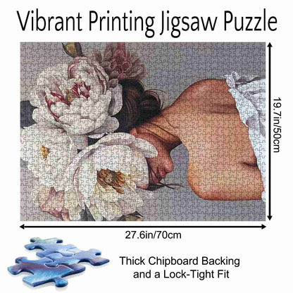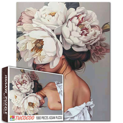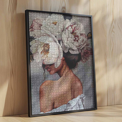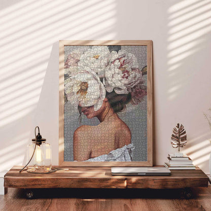 Ce magnifique puzzle représente le portrait serein d'une femme portant un magnifique bouquet de pivoines blanches délicatement posé sur sa tête. Les pétales délicats et les douces teintes des fleurs évoquent la tranquillité et la beauté naturelle. En parcourant ce puzzle, vous apprécierez la finesse des détails et l'élégance de ce motif. Parfait pour les amoureux de la nature, des fleurs et de l'imagerie artistique, ce puzzle offre une expérience relaxante et enrichissante, quel que soit leur niveau.
