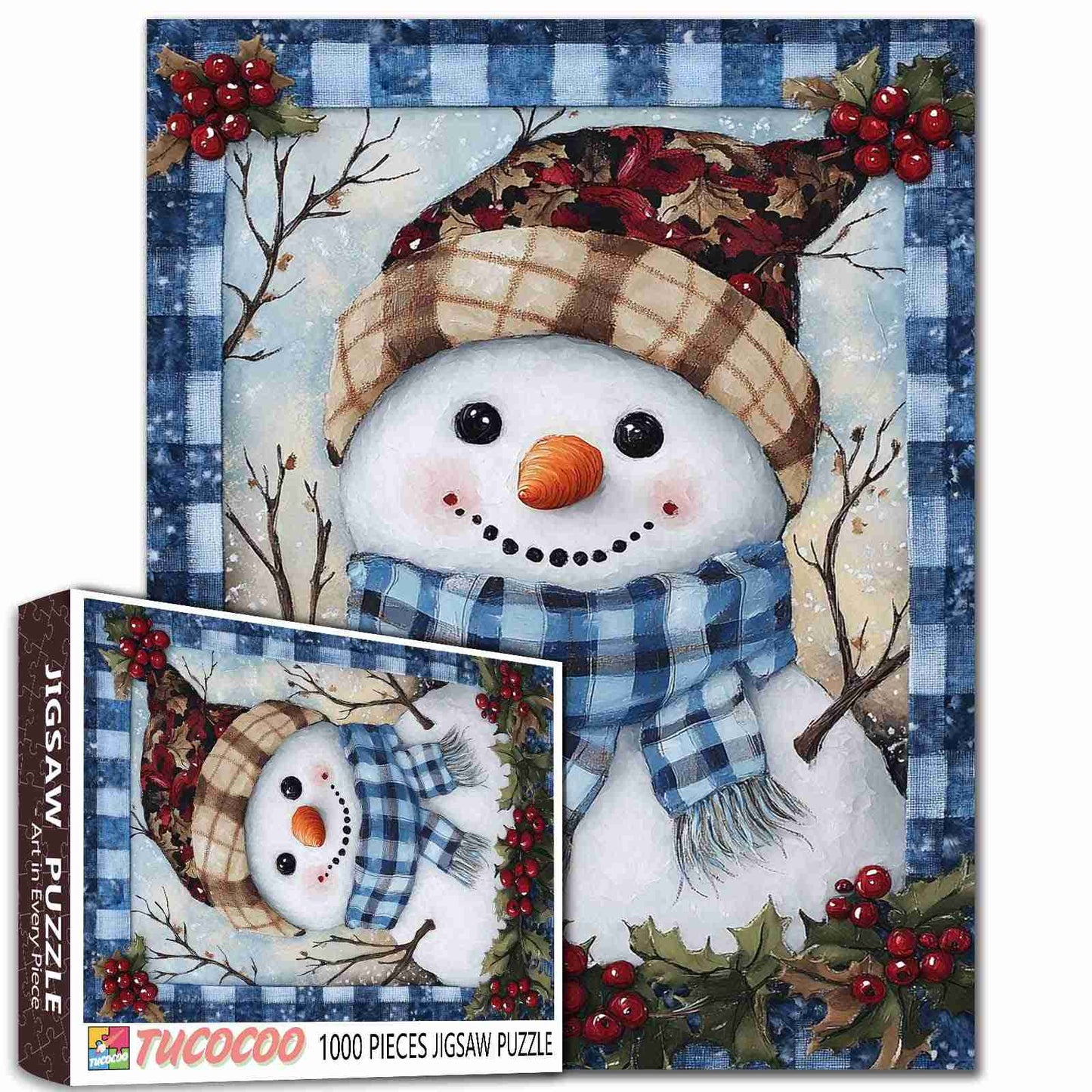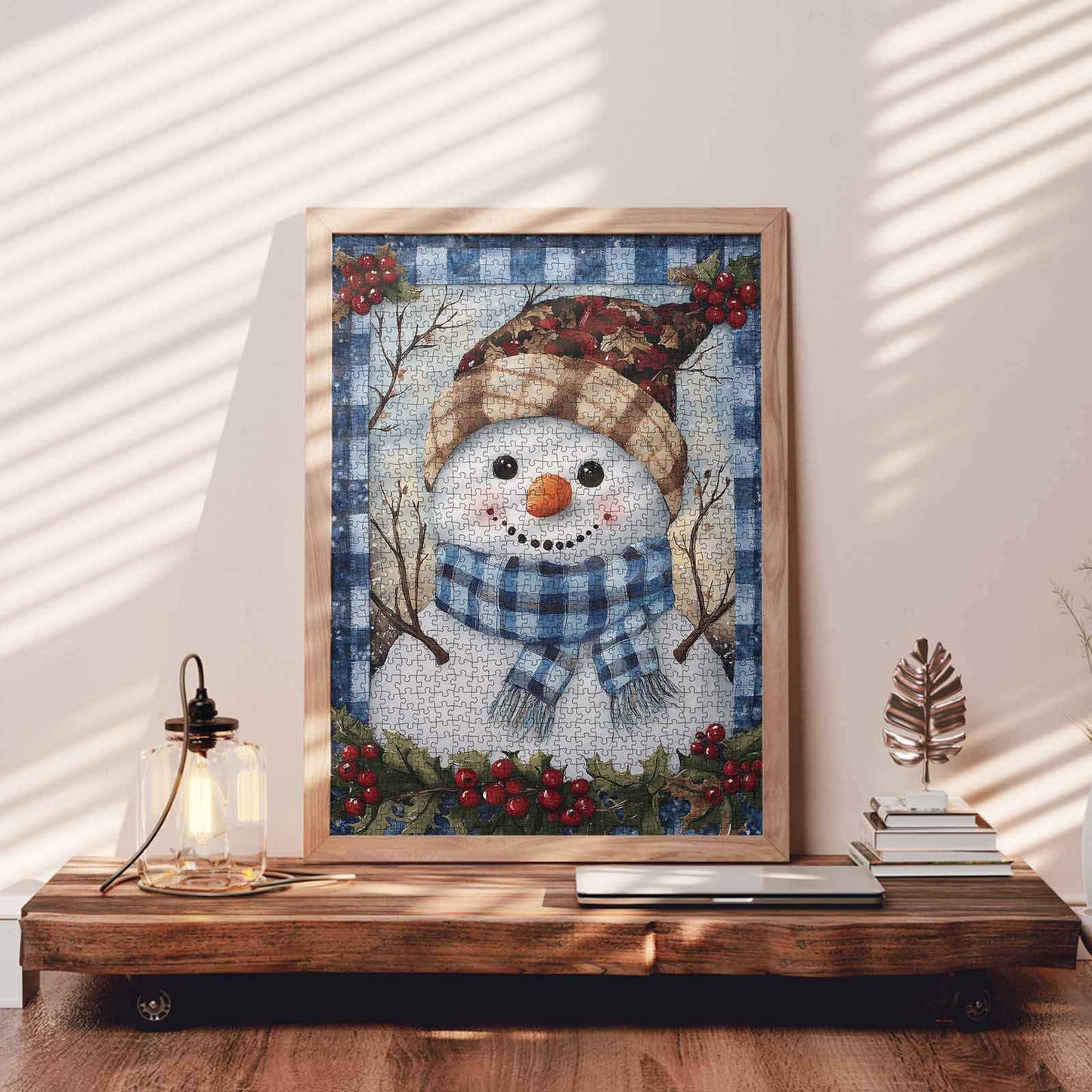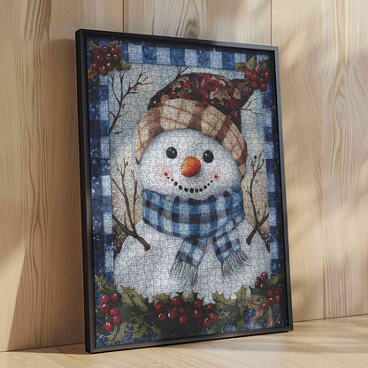 Enveloppé dans une écharpe écossaise bleue et coiffé d'un bonnet d'hiver patchwork, ce joyeux bonhomme de neige se dresse au milieu des baies de houx et des motifs brodés. Ses joues roses, son large sourire et ses yeux ronds rayonnent de joie, telle une carte de Noël faite main. Ce puzzle évoque la douceur d'une journée enneigée passée au coin du feu, bercée par le doux murmure d'une musique de Noël.