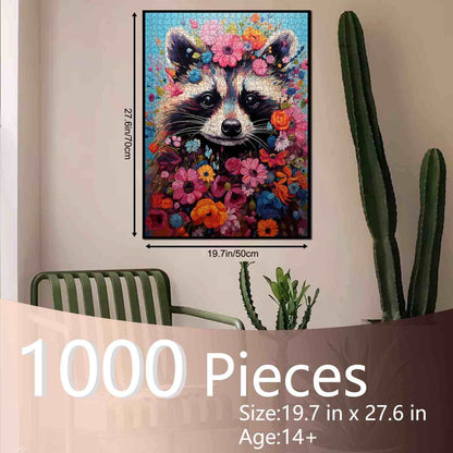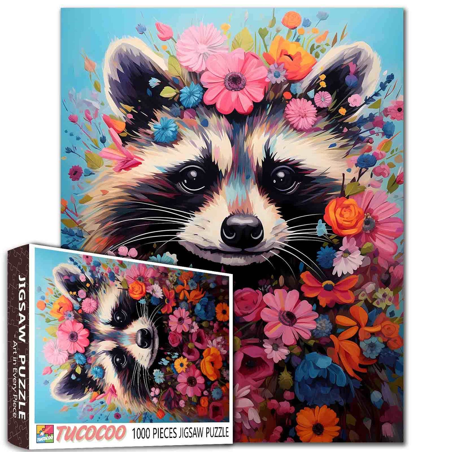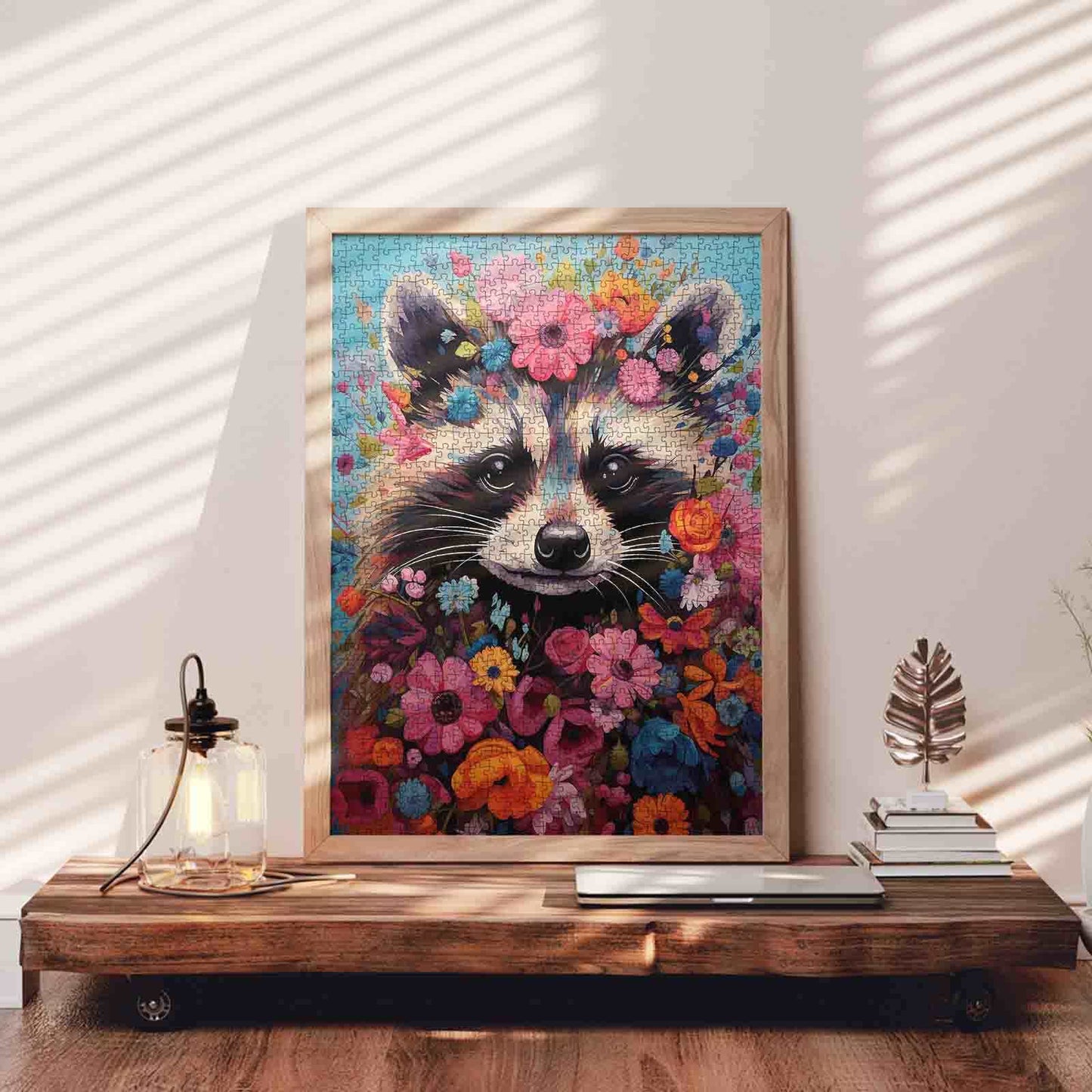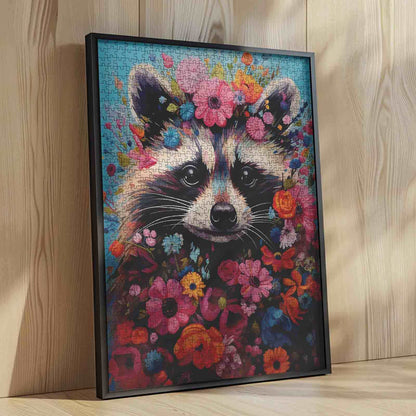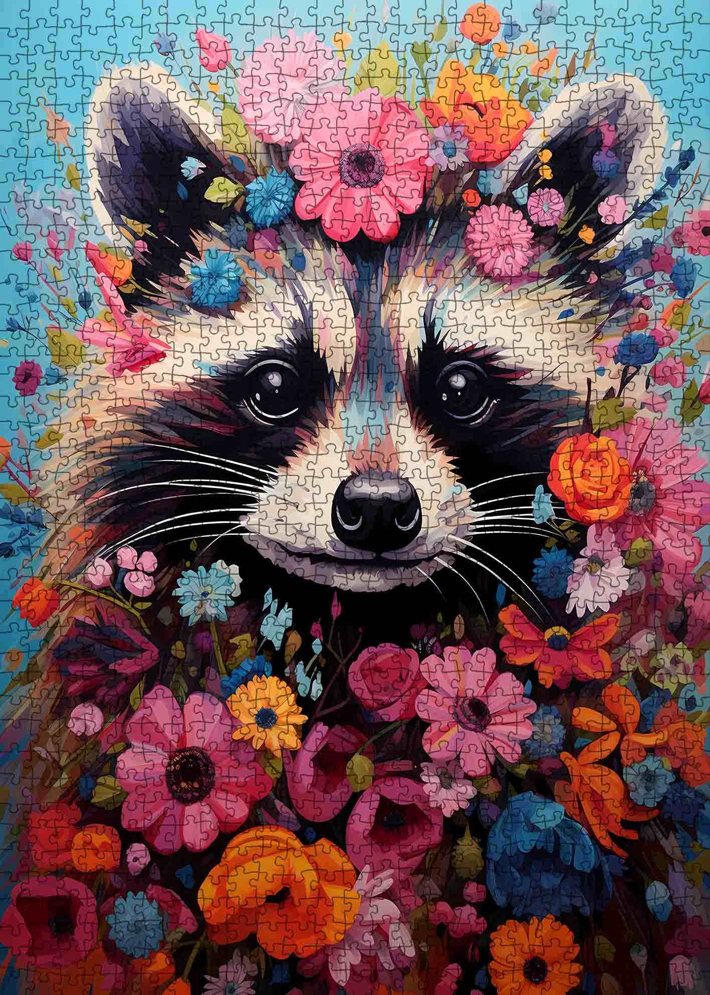 Un raton laveur aux yeux doux surgit d'une explosion de fleurs colorées, sa fourrure se fondant harmonieusement dans un jardin de pétales éclatants. Avec son regard expressif et son sourire curieux, ce petit compagnon de la forêt séduit les cœurs en se cachant parmi les oranges, les roses et les bleus éclatants. Le style joyeux et peint à la main confère à ce puzzle une énergie joyeuse, faisant de chaque pièce une découverte de personnalité et de couleur.