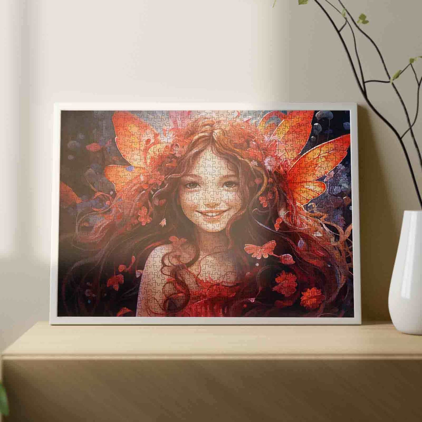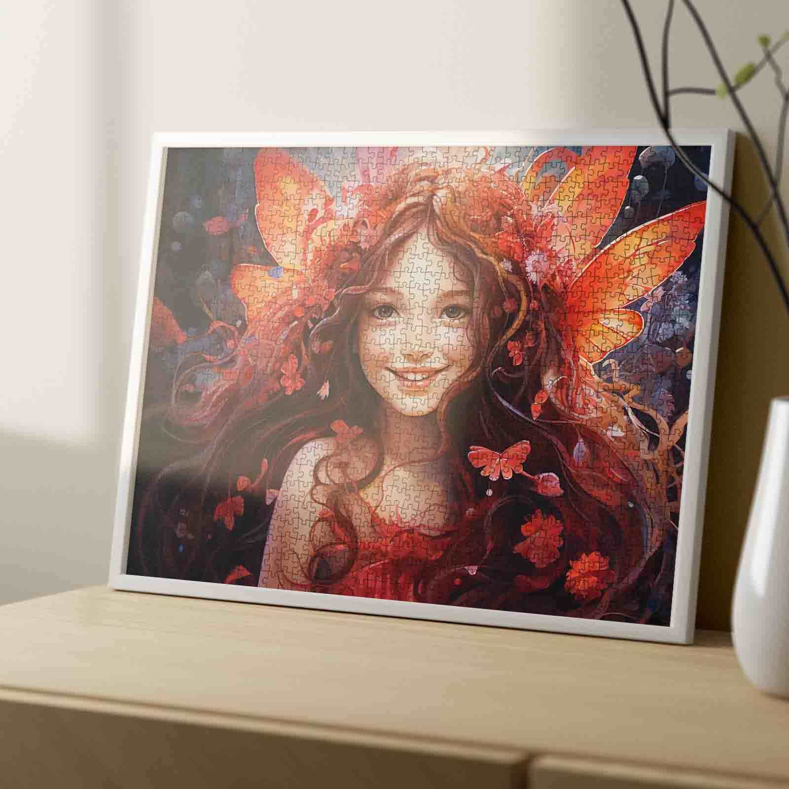 Dans un tourbillon de pétales rouges éclatants et d'ailes de papillon flamboyantes, une fée rayonne d'un sourire chaleureux et joyeux. Ses longs cheveux auburn ondulent comme de la soie, tissés de fleurs et de lumière. Les tons rouges vifs contrastent avec un fond sombre, créant une lueur magique. Chaque pièce du puzzle capture un détail de son aura enchantée, offrant une évasion joyeuse et immersive dans un monde d'émerveillement et de chaleur.