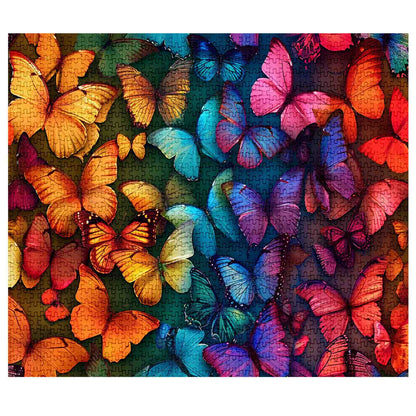 Un kaléidoscope de papillons danse sur l'image, chaque aile étant un coup de pinceau aux couleurs vibrantes. Des jaunes dorés aux violets profonds en passant par les rouges flamboyants, les papillons semblent voleter en mouvement sur un fond riche et maussade. Résoudre ce puzzle donne l'impression de capturer un instant fugace dans la nature, empreint d'élégance, d'énergie et de beauté rayonnante.